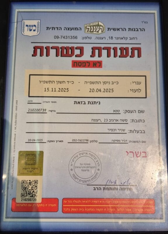 תעודת כשרות מעדנייה רעננה: