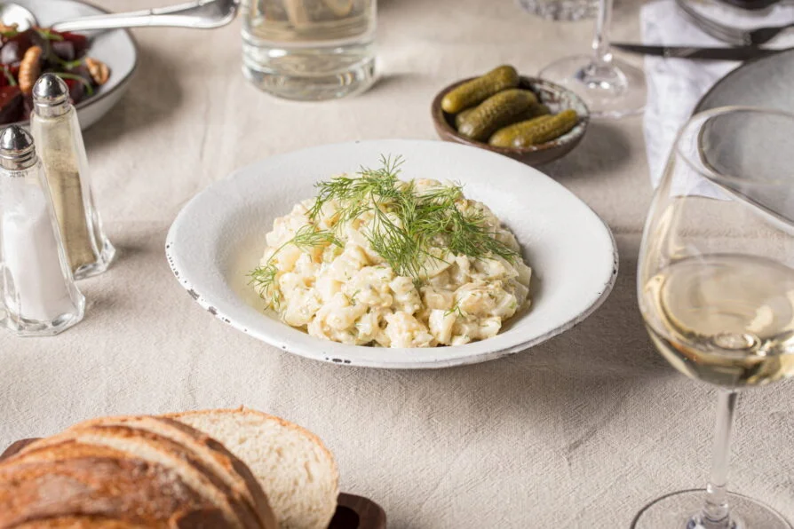 קוביות תפוחי אדמה, קורנישונים, שמיר, מיונז וחרדל.