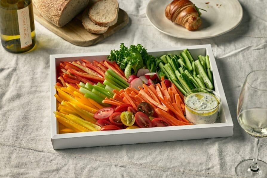 עגבניות שרי, לפל טינקרבל, רצועות גזר ומגוון ירקות גינה בהתאם למגוון העונה – חתוכים בדיוק במידה הנכונה. מוגש ברוטב ויניגרט הדרים.
