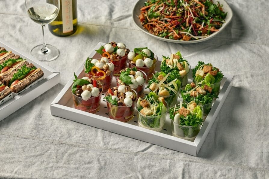 מגש כוסות פופלארי ואהוב שחציו מכיל סלט קיסר וחציו סלט קפרזה.