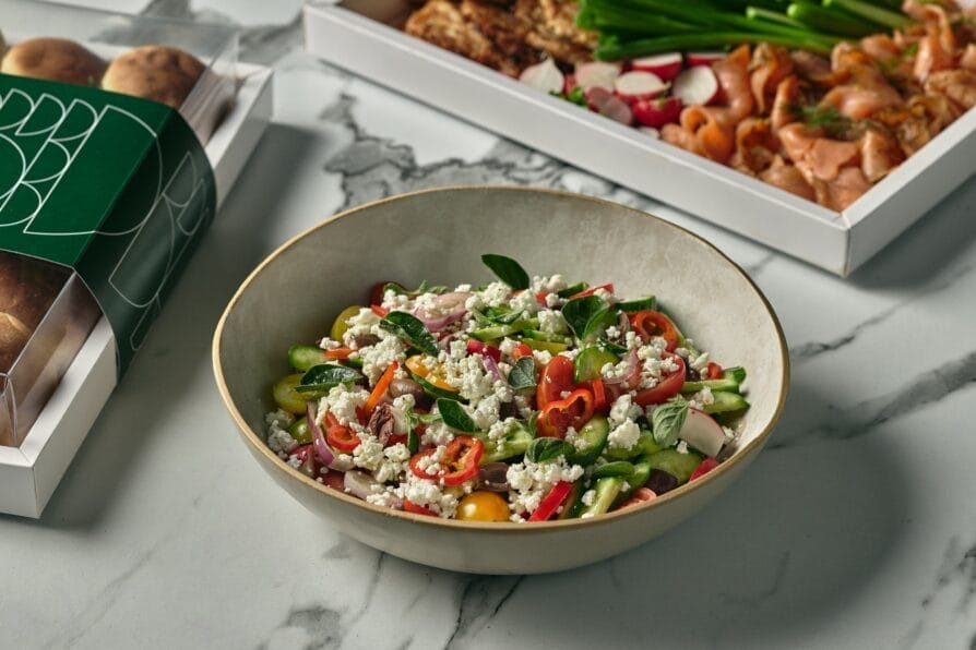 סלט פסטה מסולסלת משובצת פפלפלים צבעוניים, זיתי קלמאטה, עגבניות מיובשות עטופות בשמן זית, כדורי מוצרלה, אגוזי לוז ומיקרו עלי סלק טעימים.