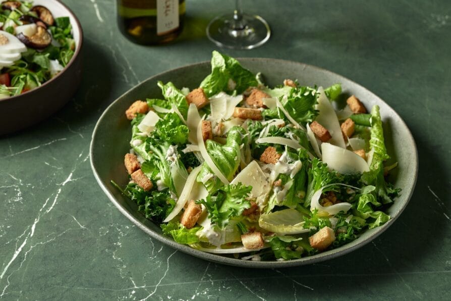 אנדיב, חסה קיסר, שפע של קרוטונים פציחים וגילופי גבינת פרמז’ן.