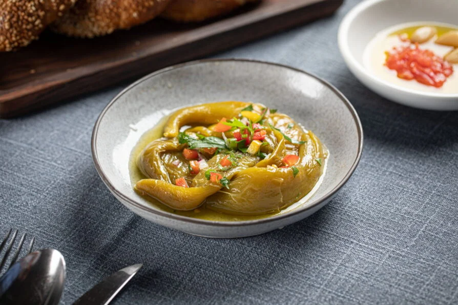 פלפלים ירוקים חריפים קלויים על האש, בתחמיץ של שום, מיץ לימון ושמן זית.