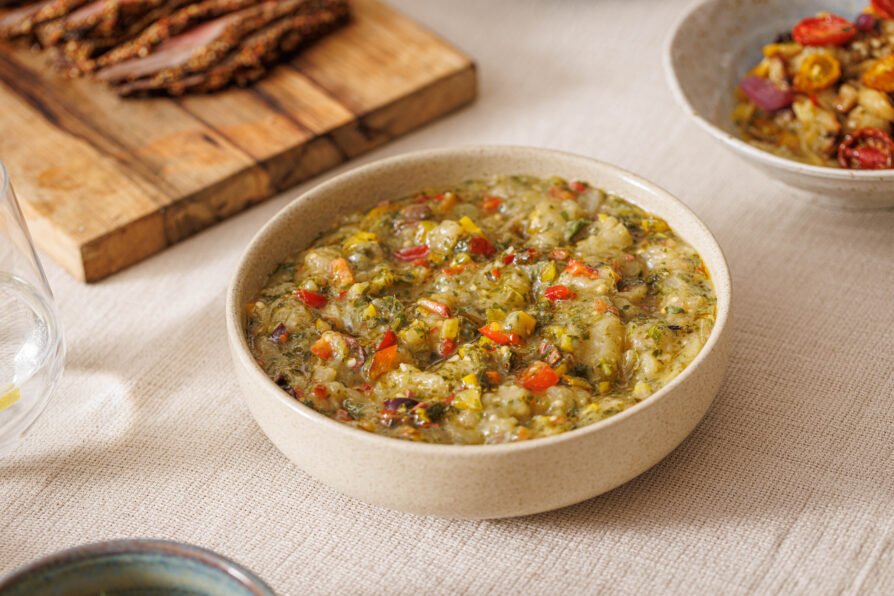 חציל שרוף על גחלים, קצוץ עם טחינה לבנה.