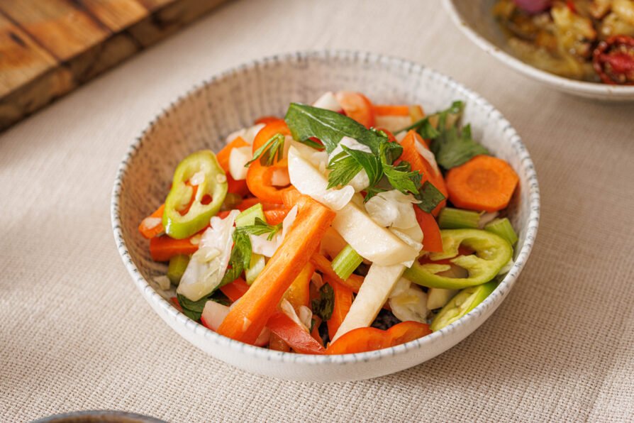 רצועות ירקות שנכבשו קלות בלימון ומלח גס.