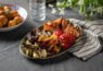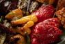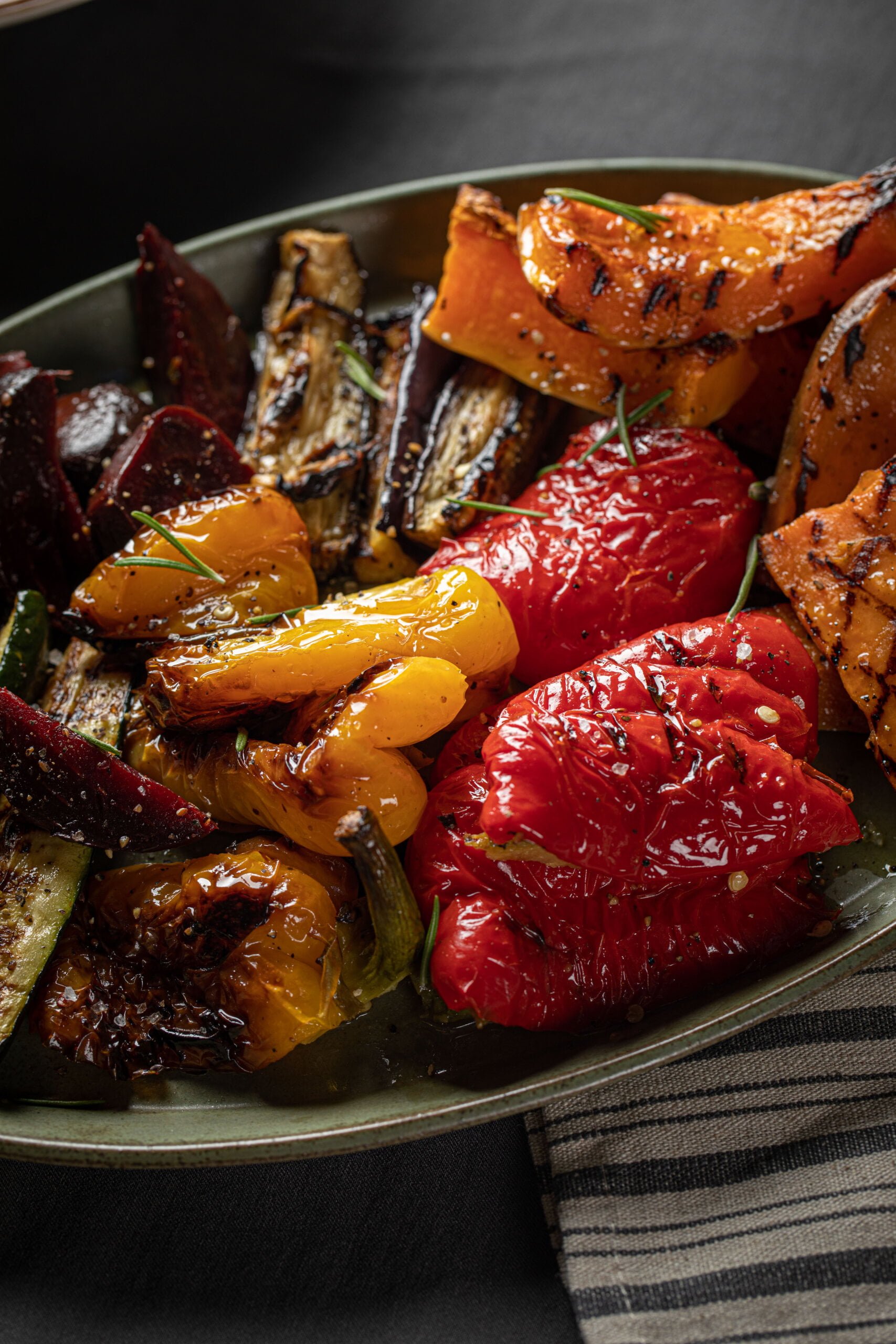 חצילים, זוקיני, בטטות, דלורית, סלק ופלפלים צבעוניים קלויים בתנור עם שמן זית.