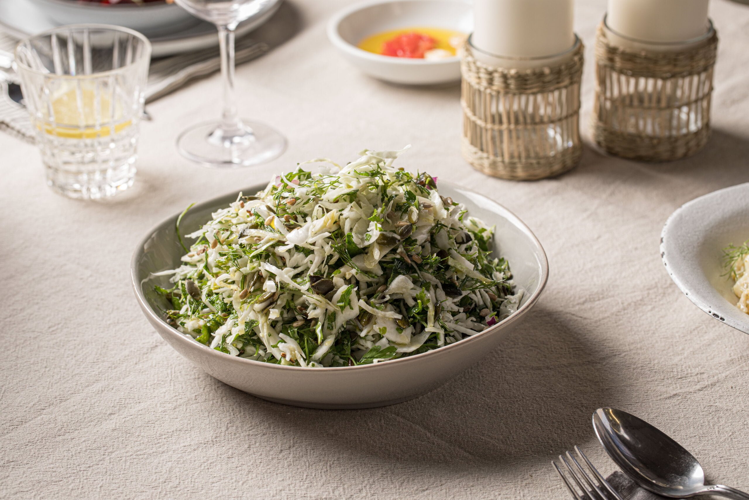 כרוב לבן, שמיר, אורז בר, גרעיני חמניות, שמן זית ומיץ לימון.