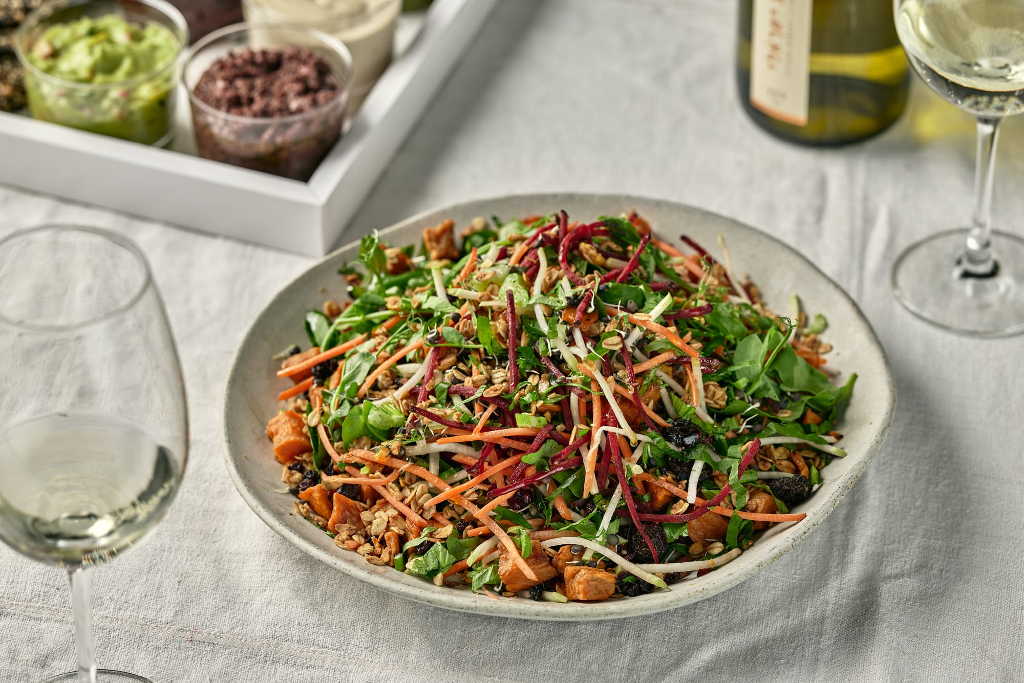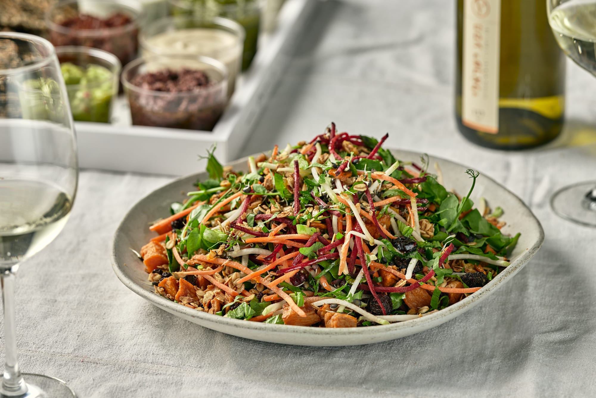 סלט בריאות גדול תמיד זוכה לפופולאריות גדולה בזכות קינואה אדומה ולבנה, קוביות בטטה מתוקות בדיוק במידה הנכונה, בצל ירוק, חמוציות ועוד מגוון חומרי גלם משובצים בהנאה.