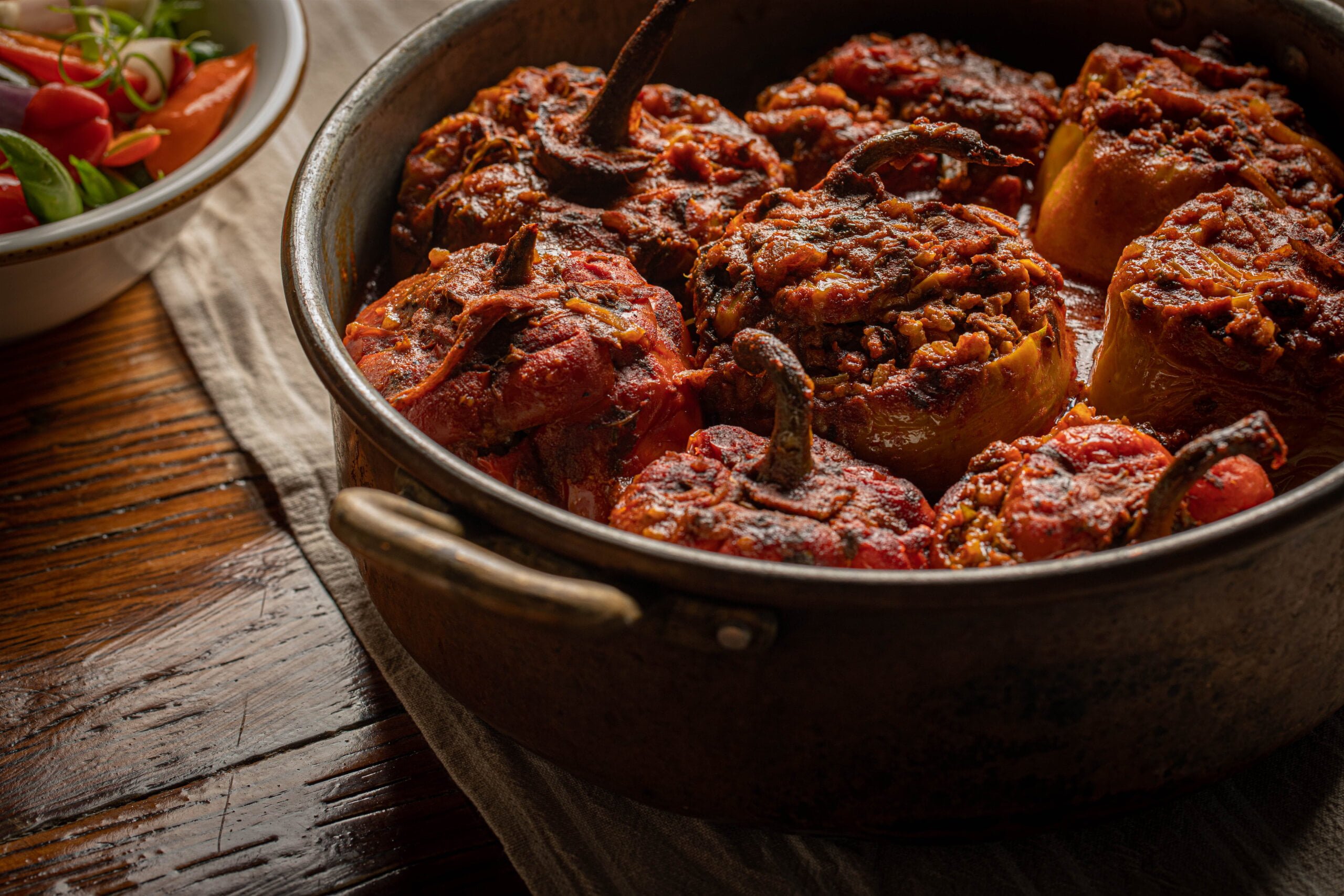 פלפלים צרובים בתנור, ממולאים באורז ועשבי תיבול ומבושלים ברוטב עגבניות.