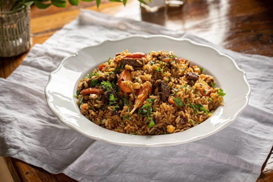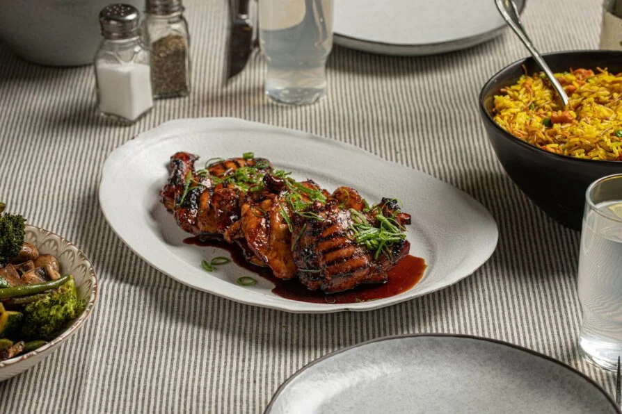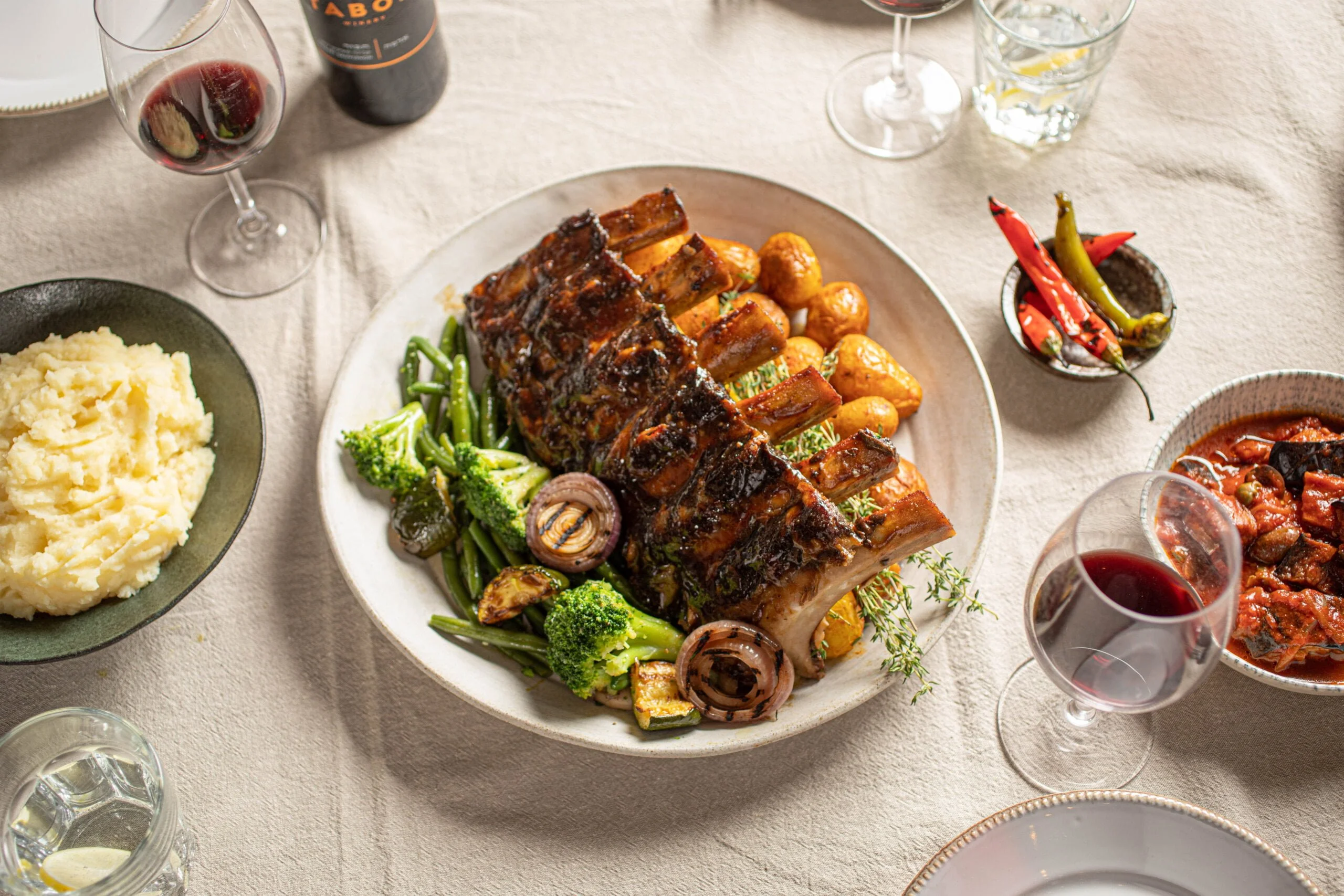 שדירת צלעות בקר צלויות ברוטב יין אדום וציר בקר, עם בצלצלי שאלוט ופטריות.