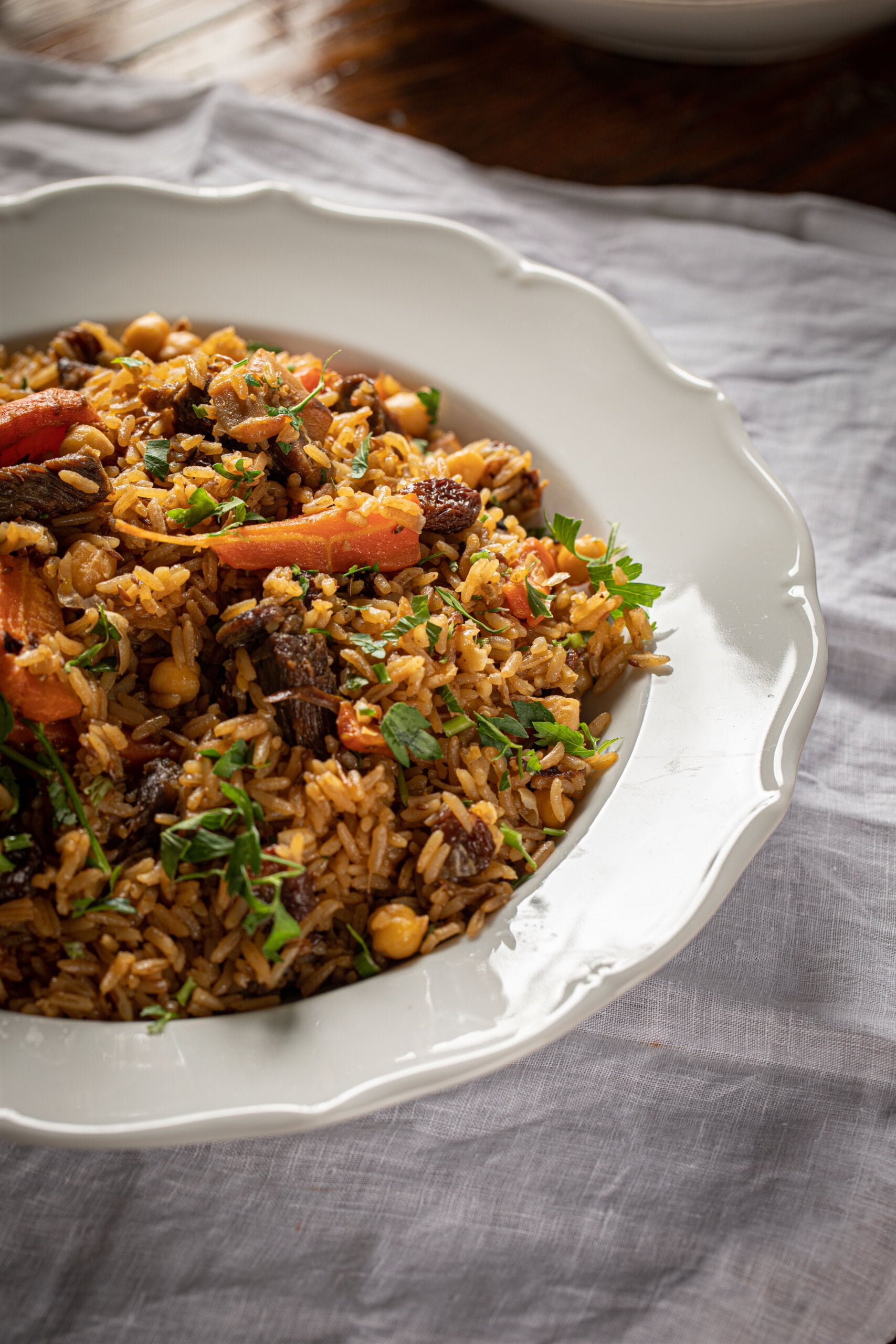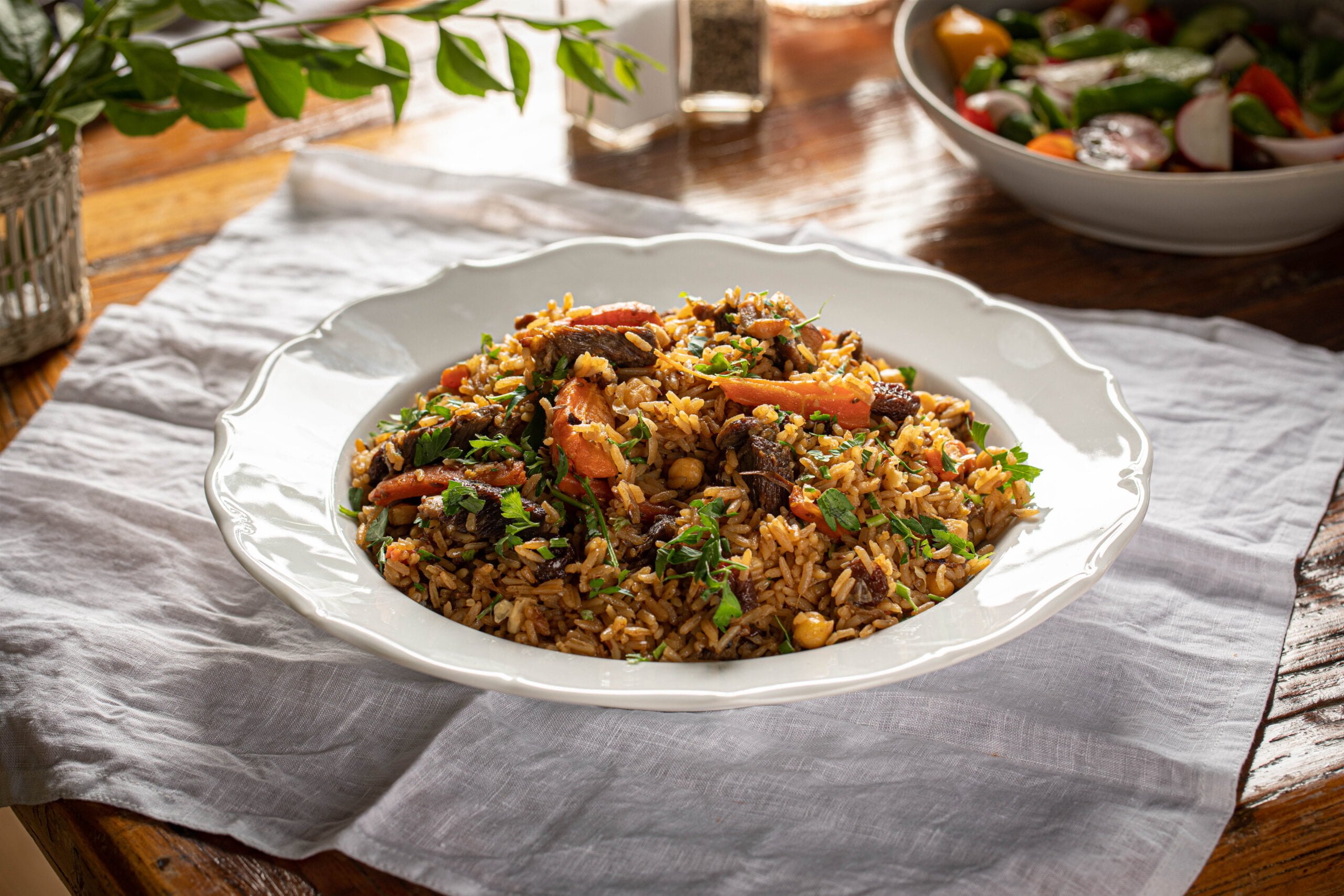 אורז בסמטי עם נתחי פרגית ובשר, גרגירי חומוס, גזר ובצל, בתיבול כמון.