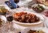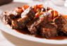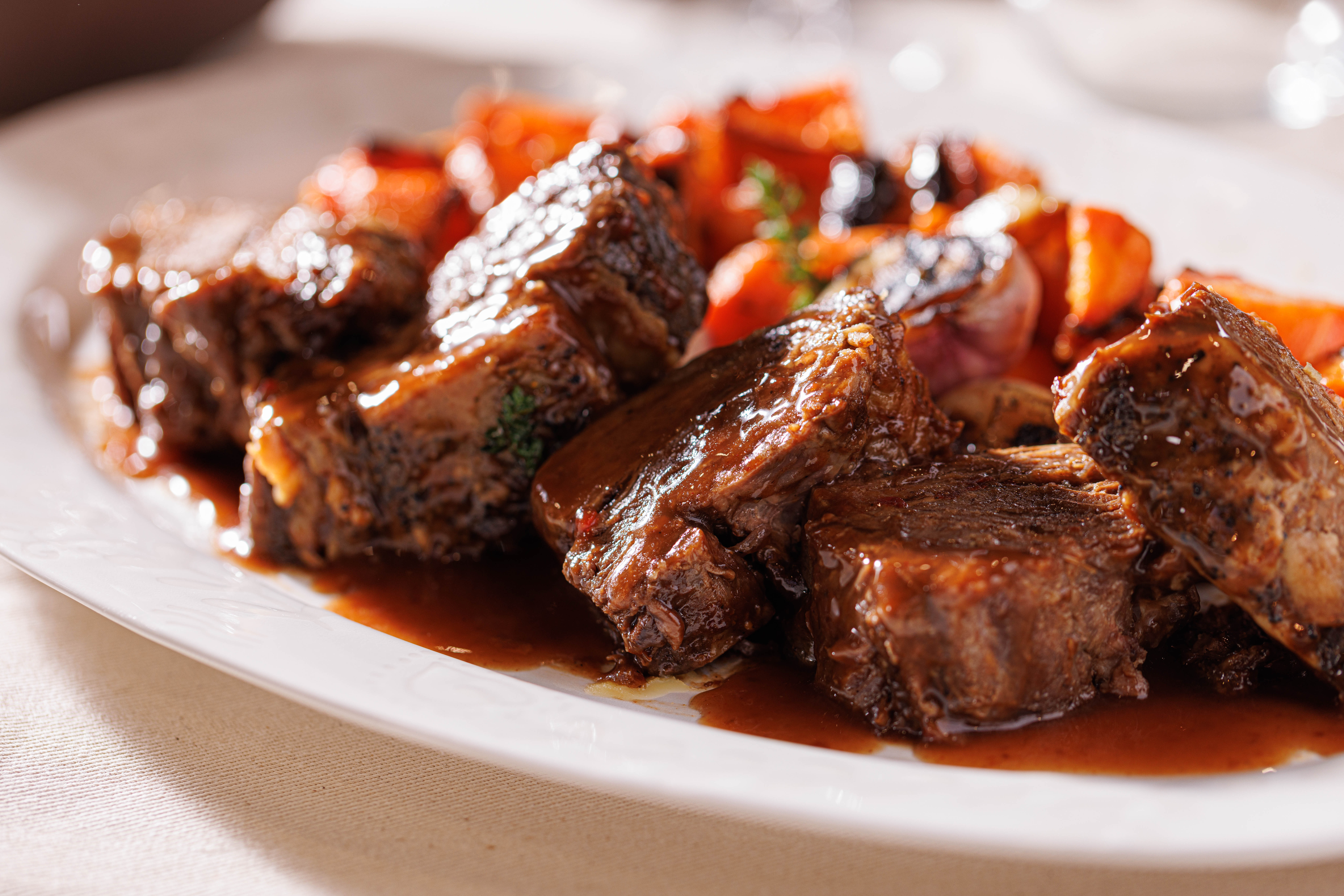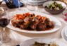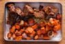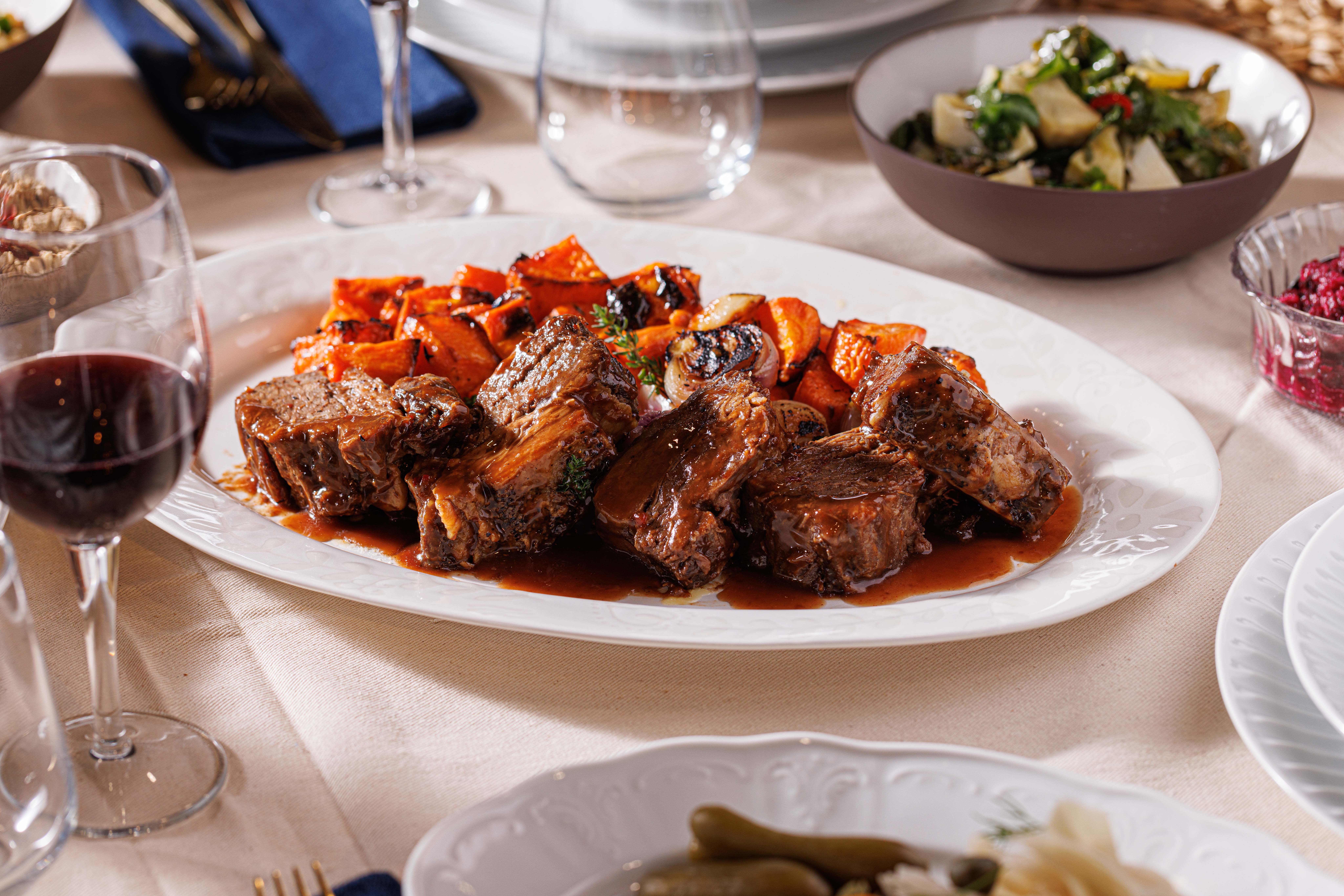 אסאדו בבישול ארוך, ירקות כתומים, ציר בקר ויין, מוגש בתבנית אלומיניום.