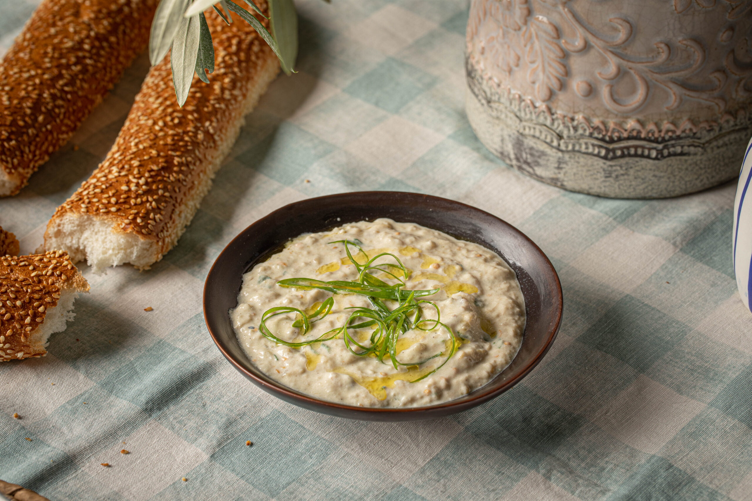 חציל שרוף על גחלים, קצוץ עם טחינה לבנה.
