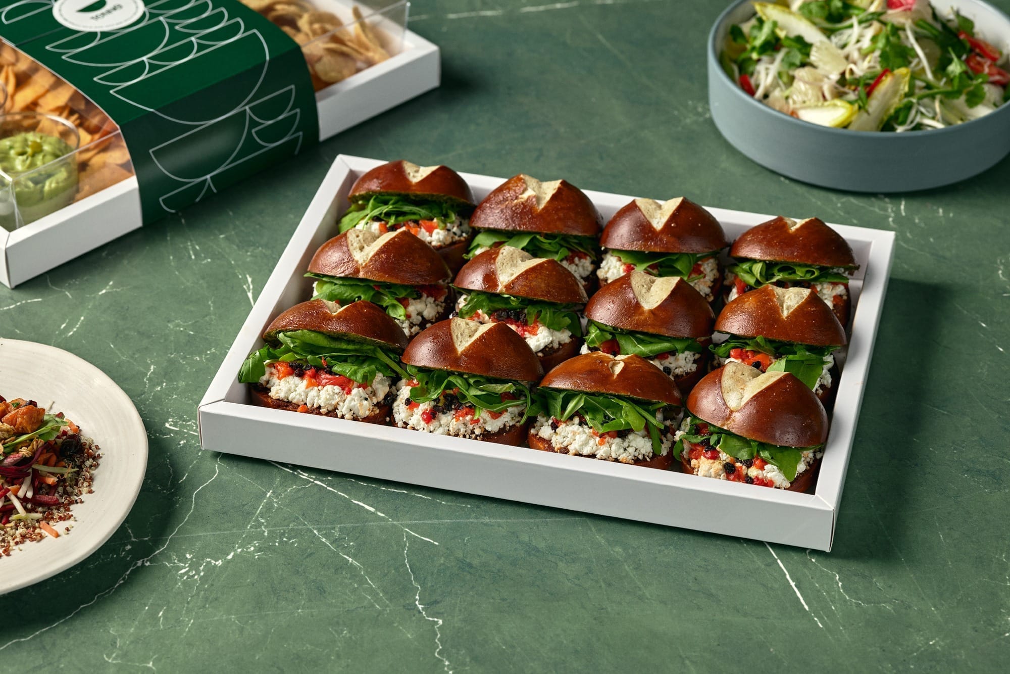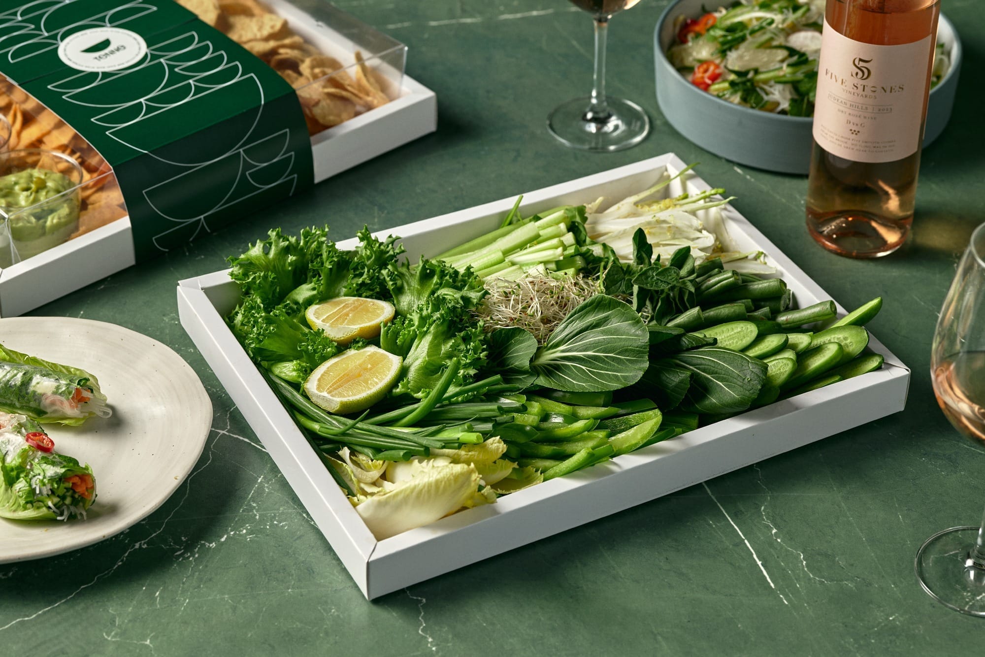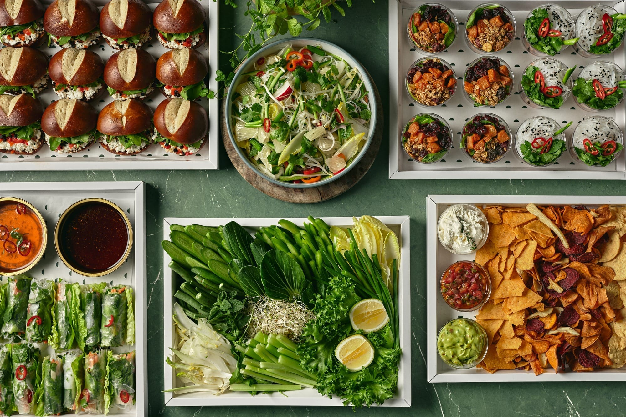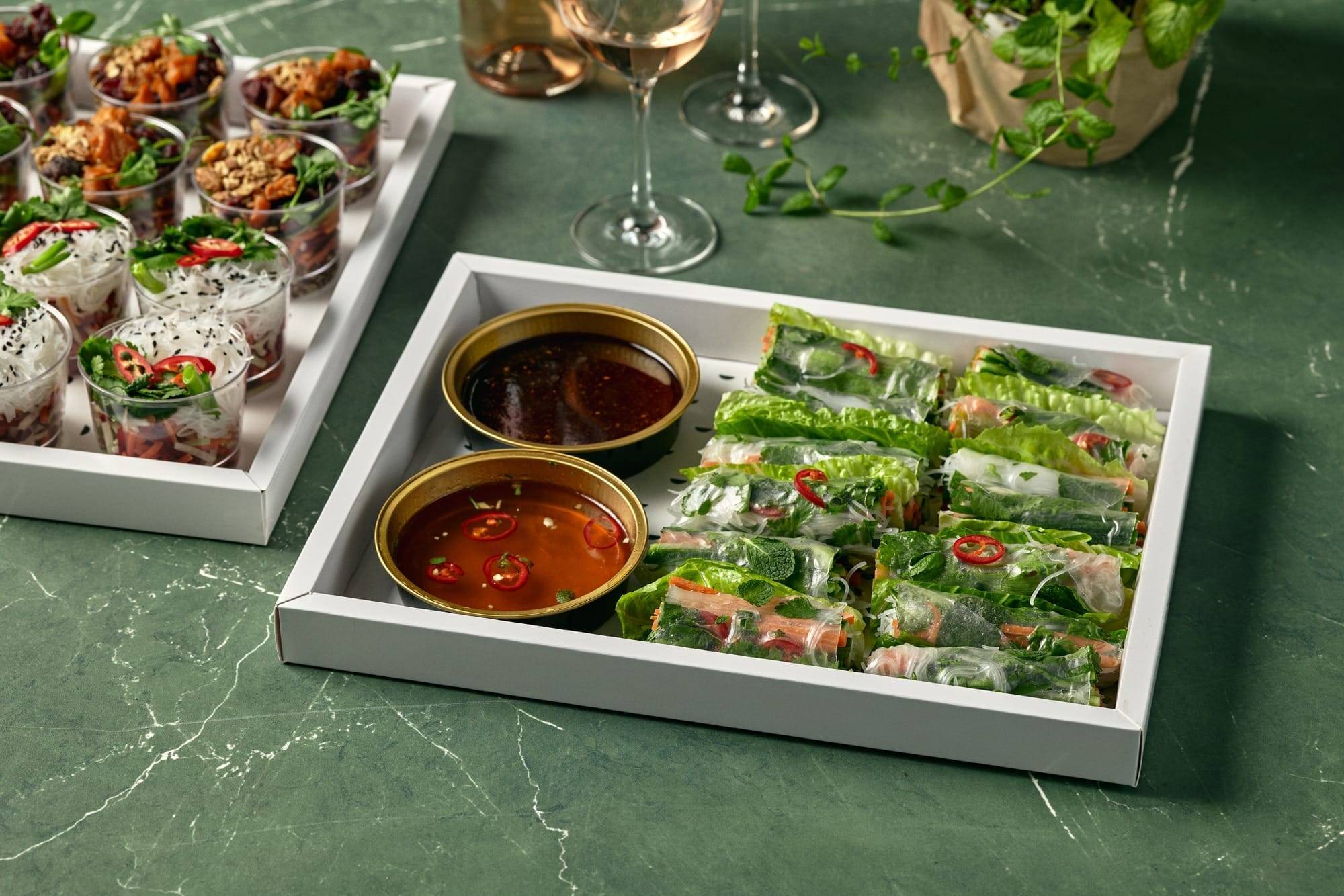 רולים פריכים, סלט אטריות שעועית מדהים, ירקות ירוקים טריים ומגוון עשיר של מגשים עם קריצה ליבשת אסיה.