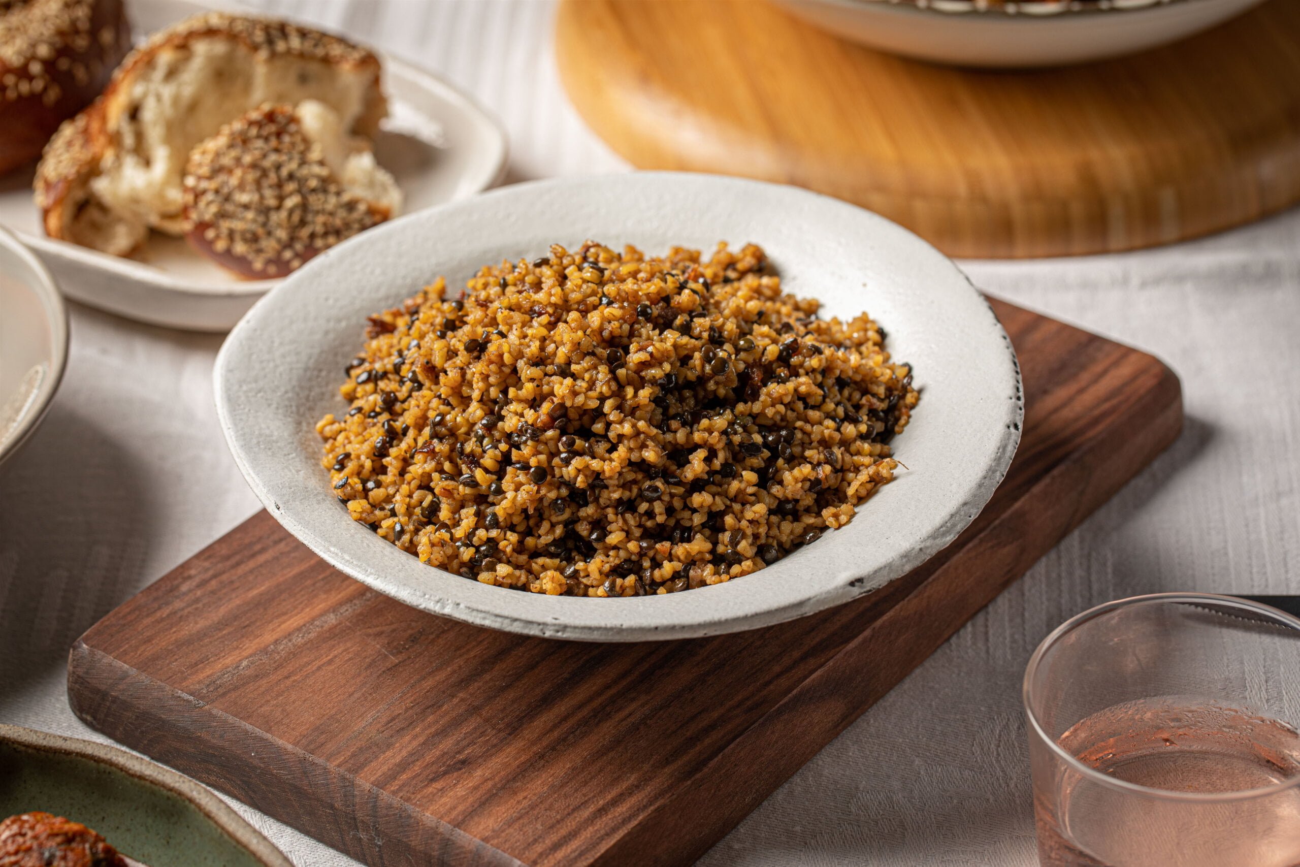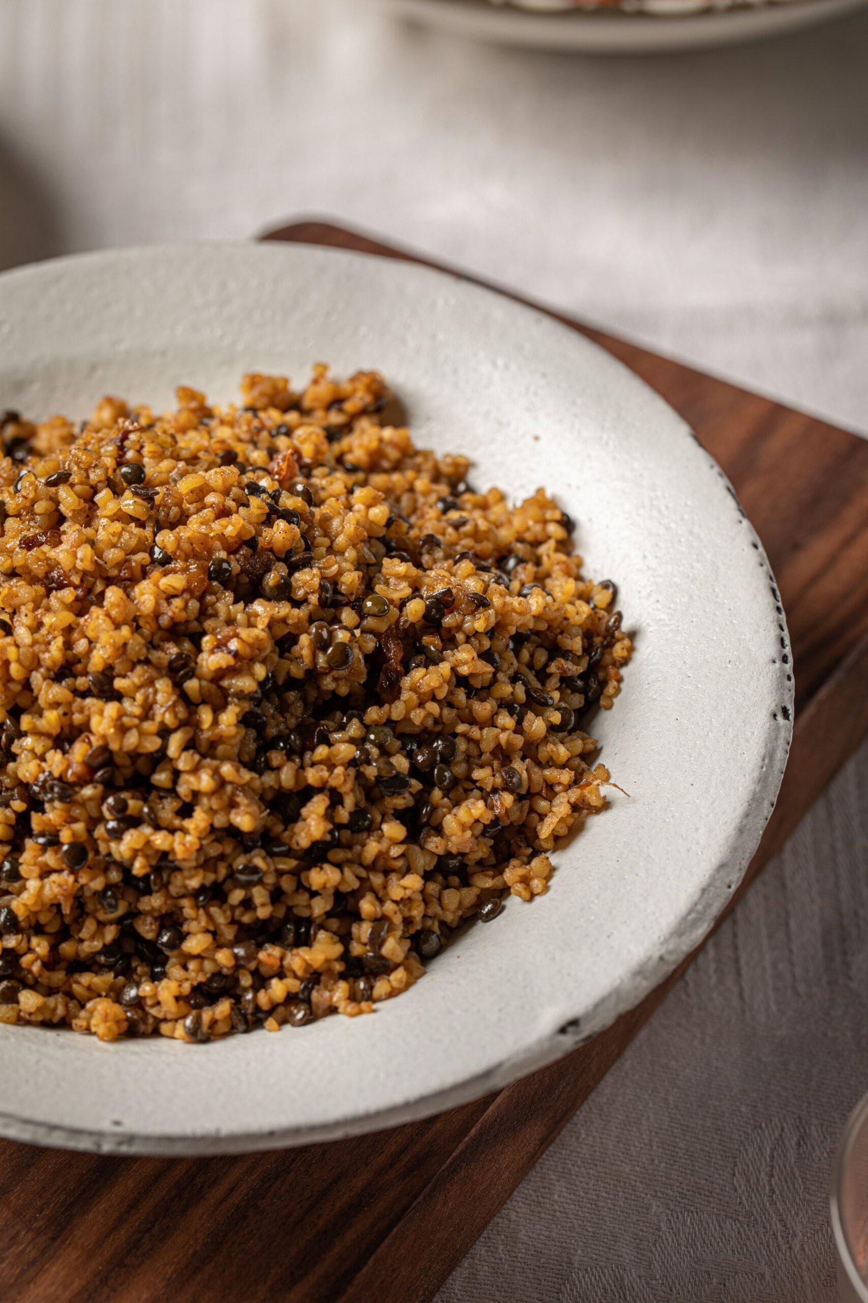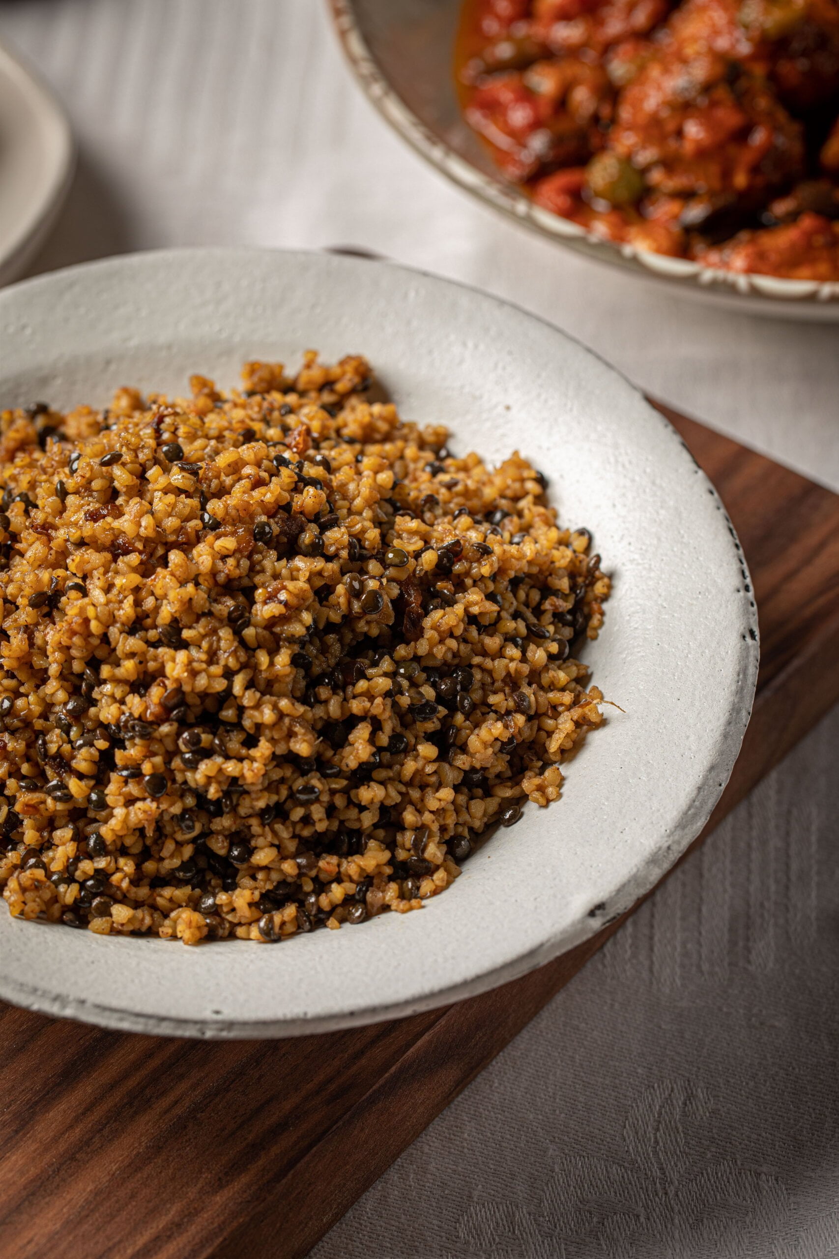 בורגול, עדשים שחורות ושפע של בצל מטוגן, בתיבול ראס אל-חנות. בדיוק כמו במטבח הערבי.