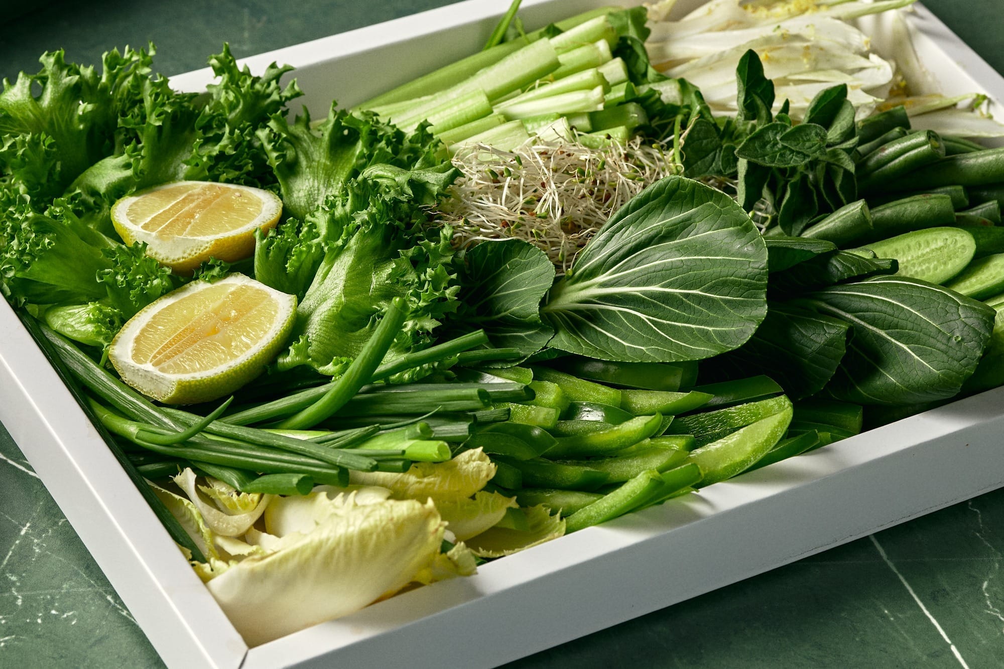 בוקצ’וי, שעועית ירוקה טרייה, חסה לליק ועוד ירוקים מדהימים שנצמדים מעולה למגוון מגשים אחרים.