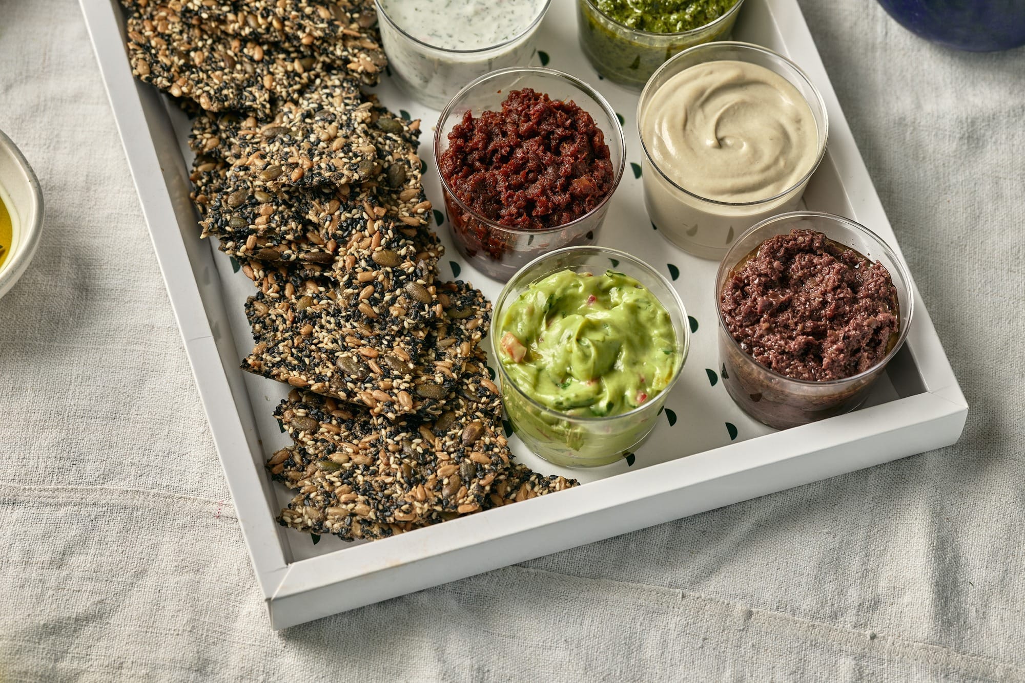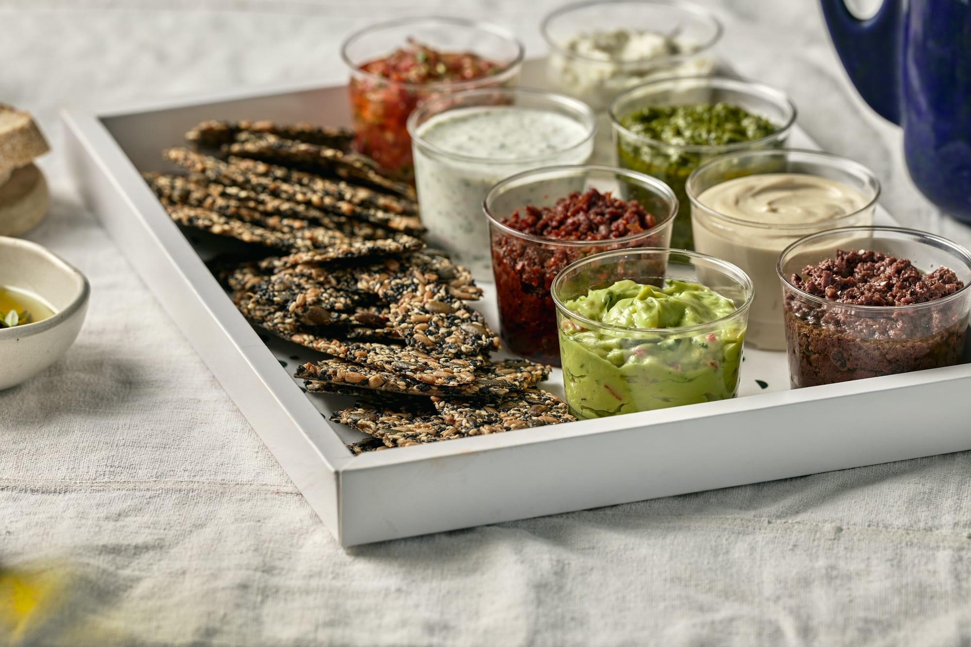 מטבל טפנד זיתים, מטבל עגבניות מיובשות, מטבל חצילים קלויים עם יוגורט ואגוזי מלך, מטבל ציזיקי לבנה, מטבל סלסה מקסיקנית עשבי תיבול, מטבל טחינה בליוי קרקרים עבודת יד.