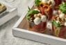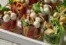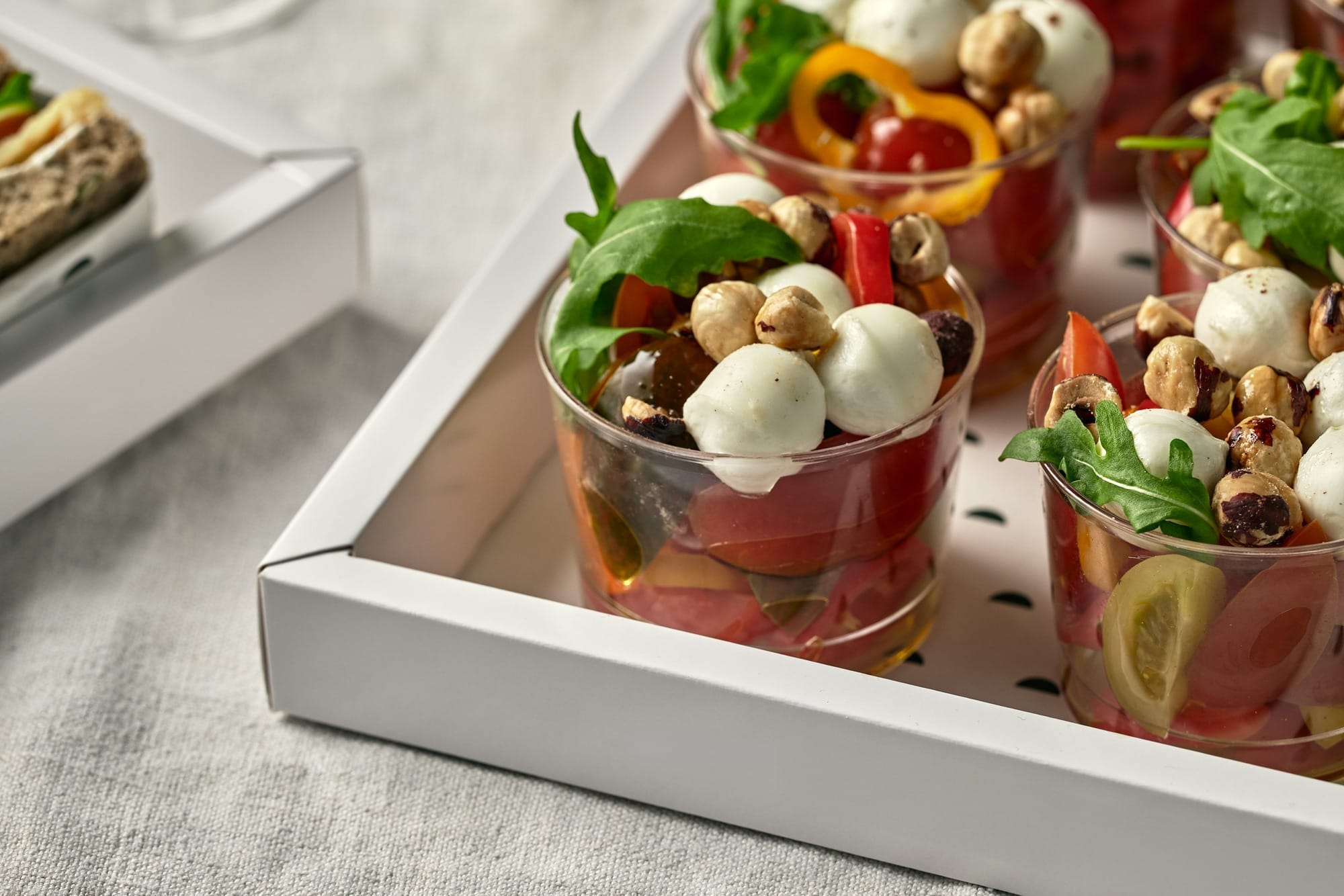 מגש כוסות פופלארי ואהוב שחציו מכיל סלט קיסר וחציו סלט קפרזה.