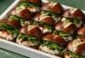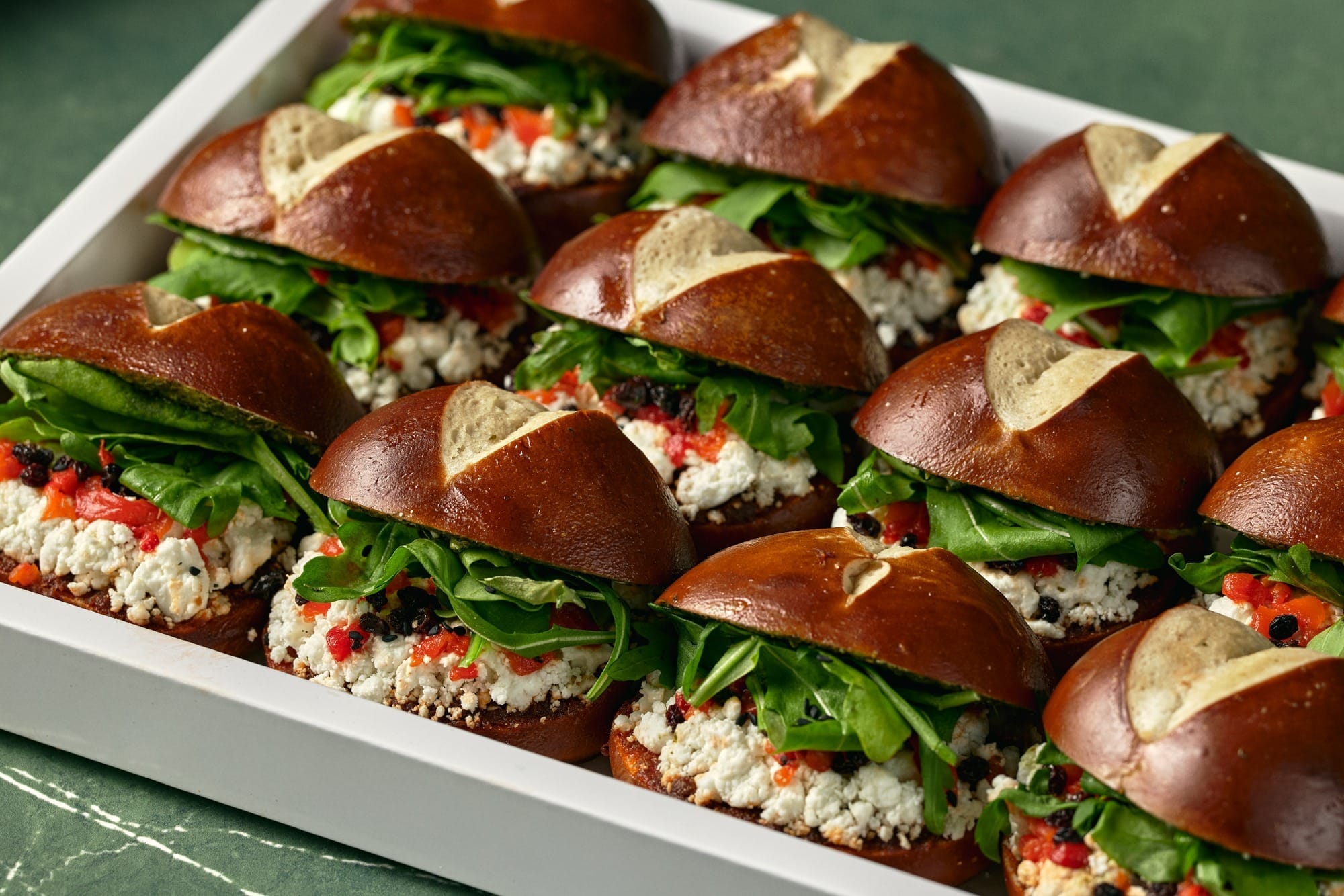 מגש מלא פרעצלים רעננים שמלאים בגבינת קממבר עזים צעירה עם תפוח עץ טרי.