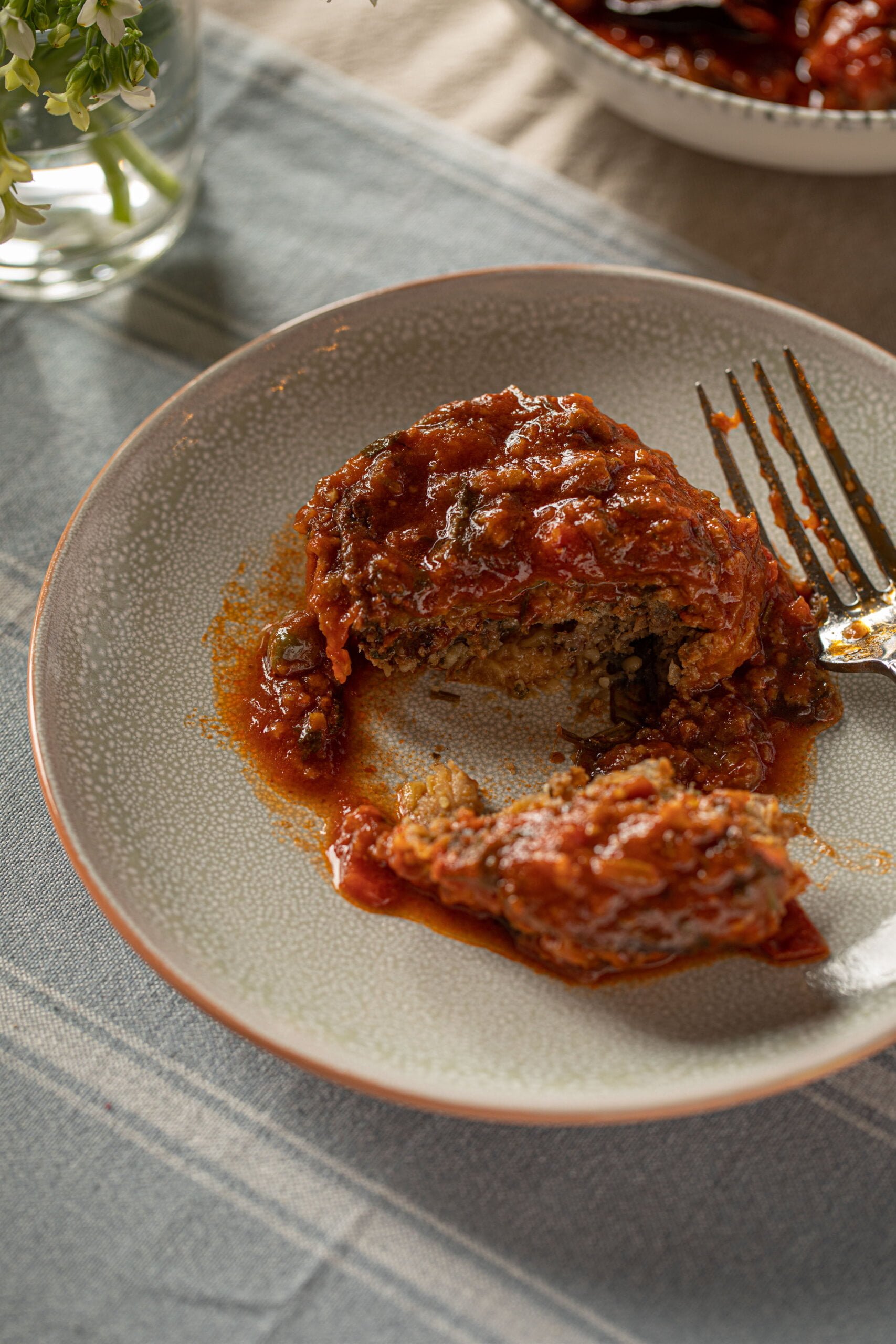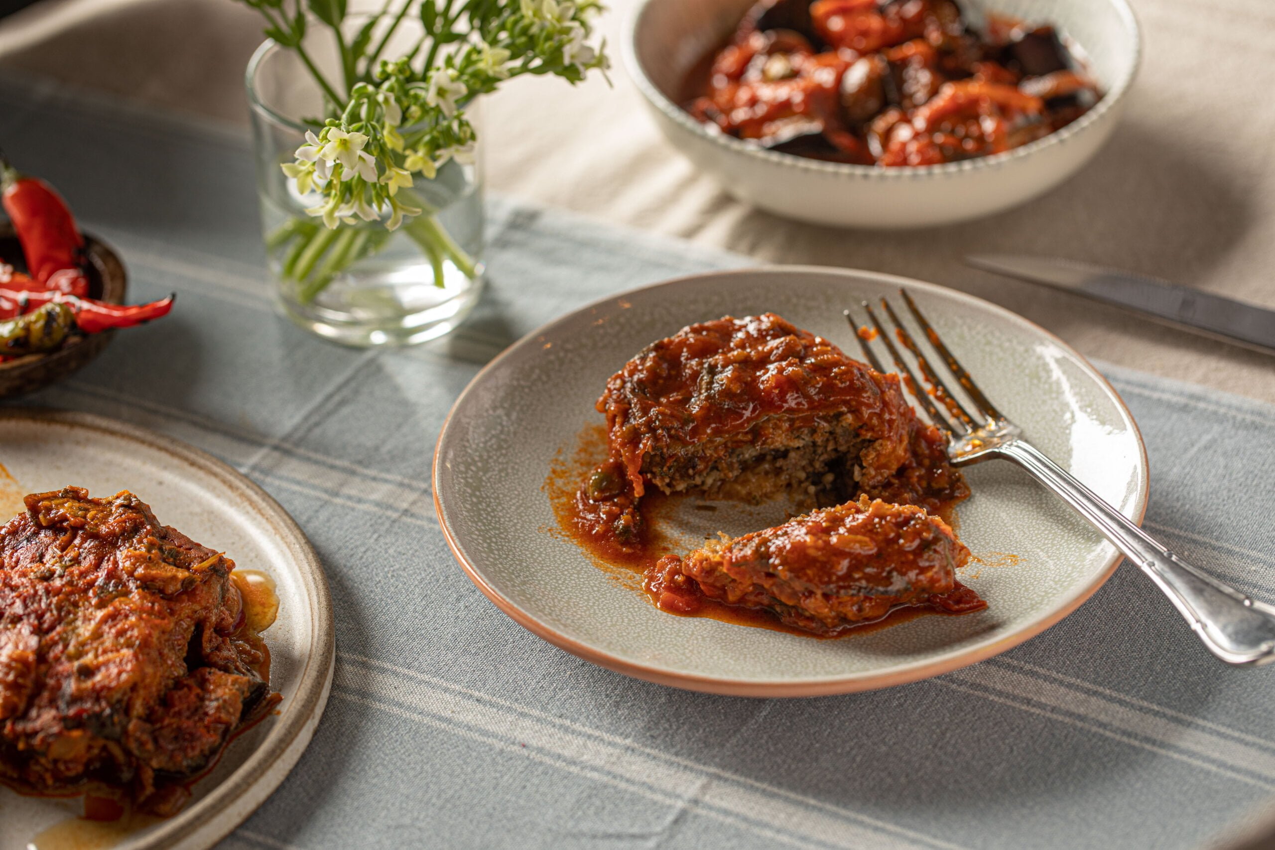 שתי פרוסות חצילים במעטפת דקיקה, חובקות בשר טחון מתובל, ומבושלות ברוטב עגבניות עשיר.