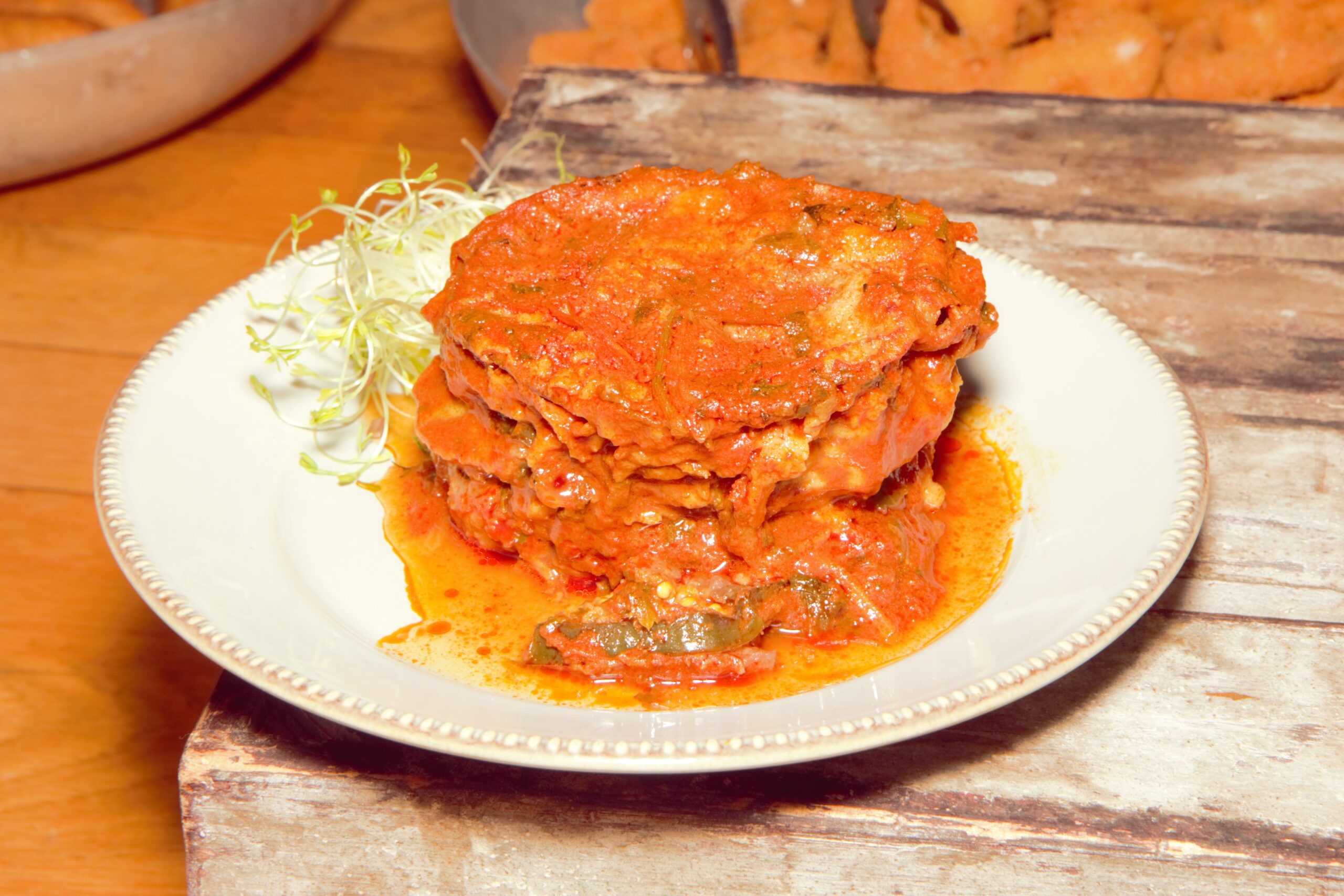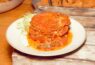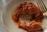 שתי פרוסות חצילים, חובקות בשר טחון מתובל, ומבושלות ברוטב עגבניות עשיר