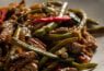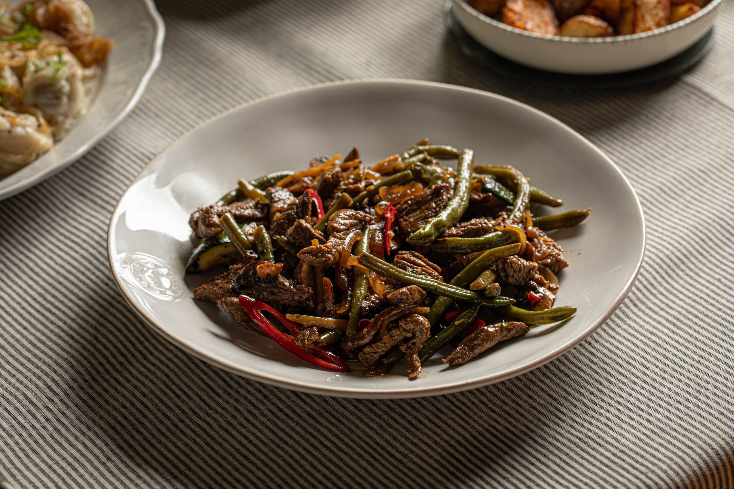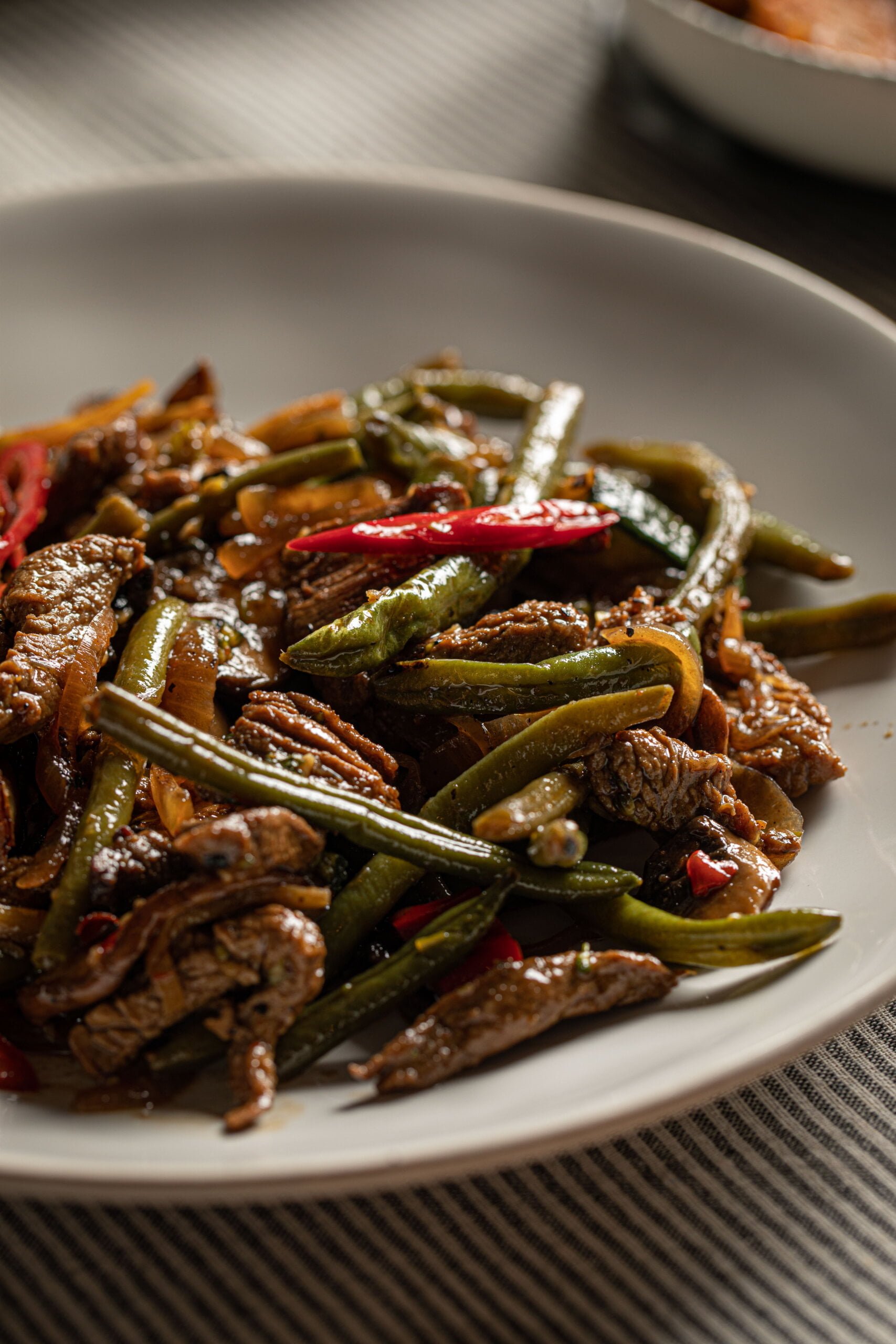 פרוסות דקיקות של פילה בקר, מוקפצות עם ברוקולי, שעועית ירוקה ובצלים, ברוטב סויה-טריאקי.