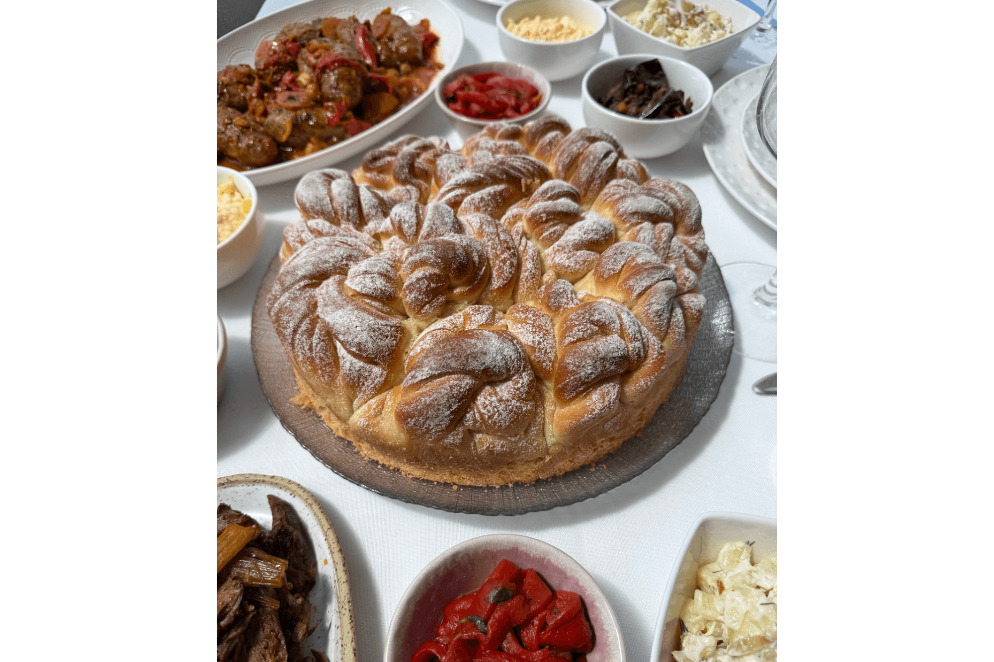 חלת שבת “שבתיה”, סלט ביצים וקריספי שאלוט, סלט ספיחה של חצילים ועגבניות, קרם חציל וסחוג ירוק, ממרח סקורדליה יווני.