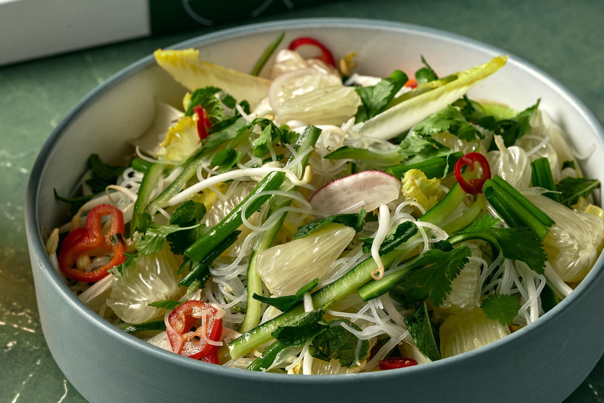 שבבי צ’ילי אדום עם נענע, כוסברה ופומלה אדומה. כל הטוב הזה עם ג’ינג’ר ליים וסירופ דקלים מתקתק בסלט בנגקוק המטריף של טנא.