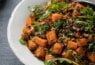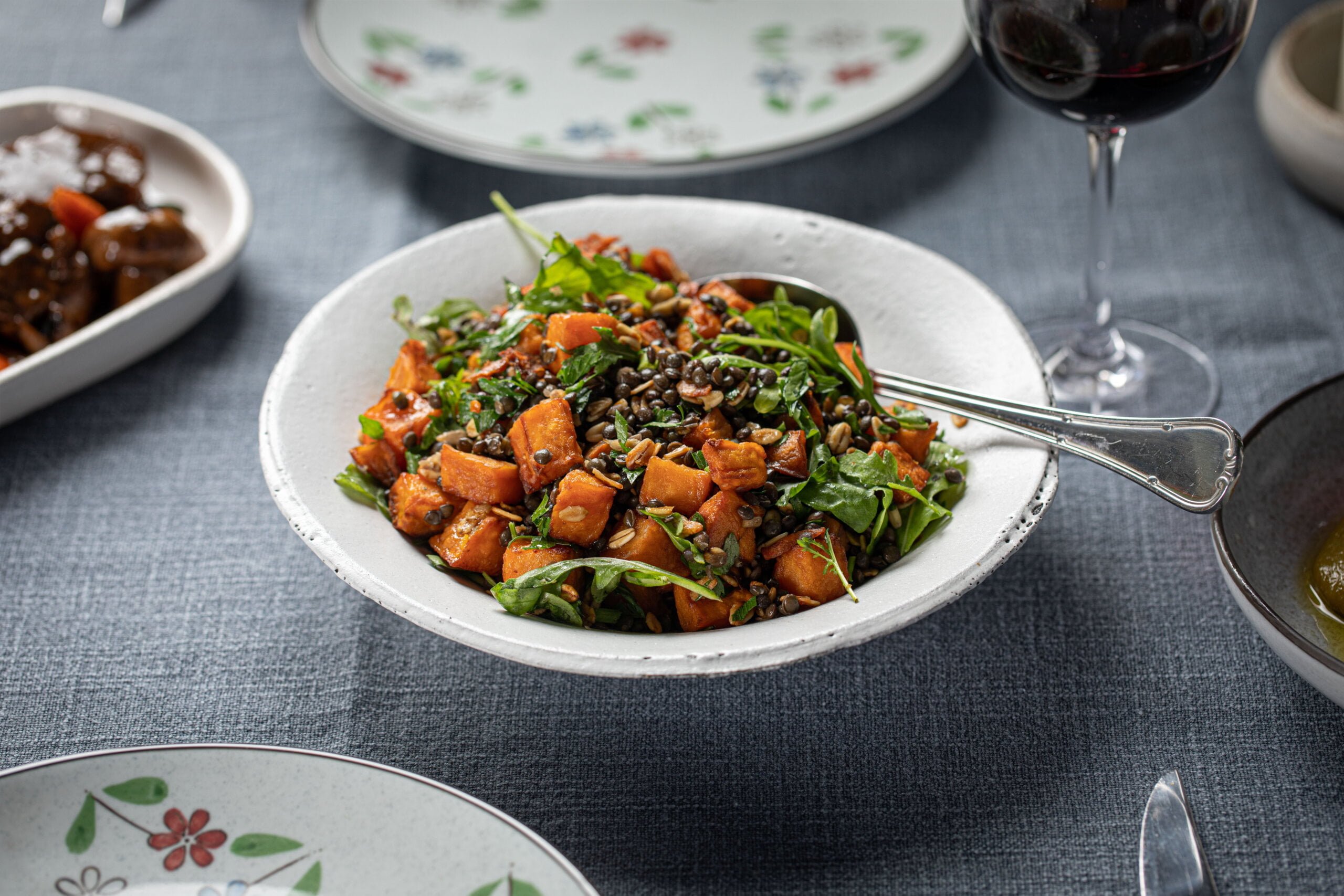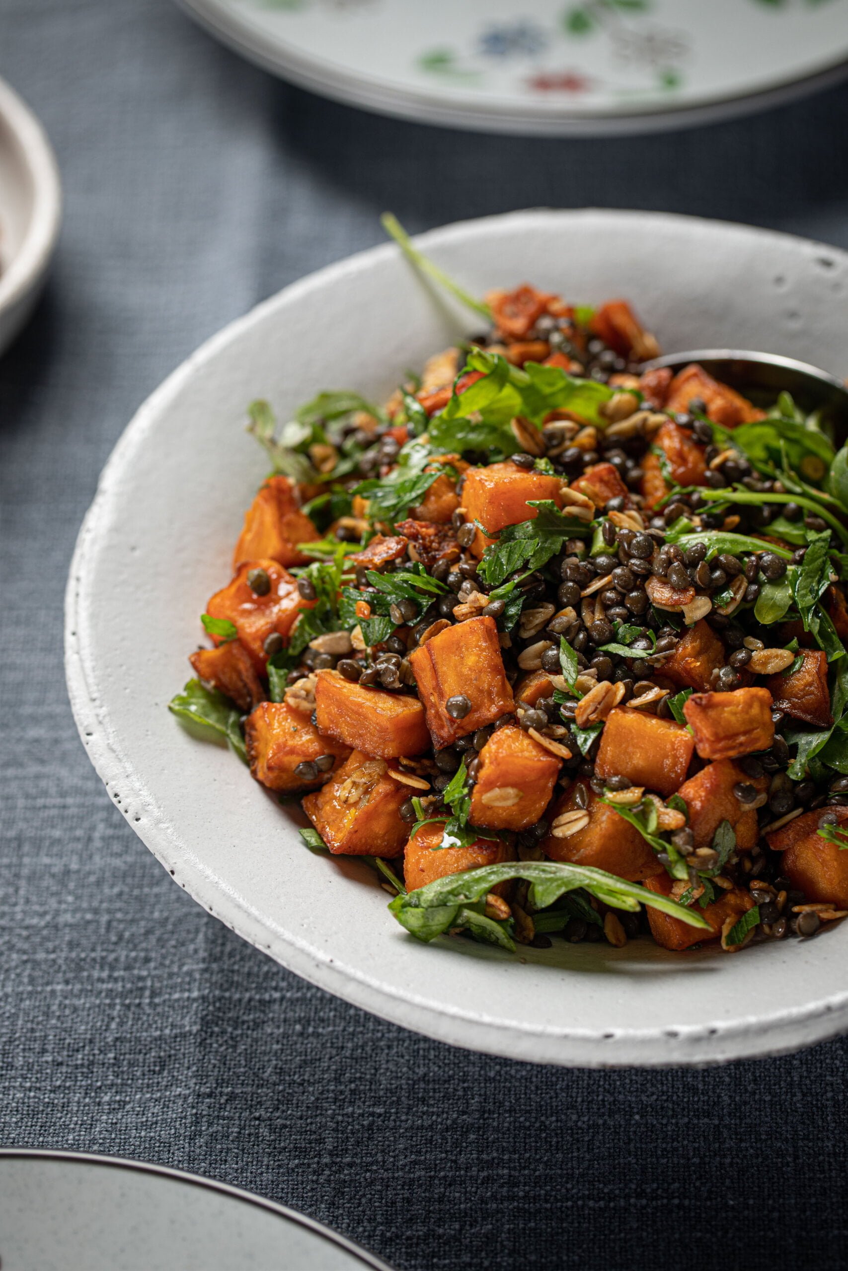 עדשים שחורות, קוביות בטטה ועלי בייבי.