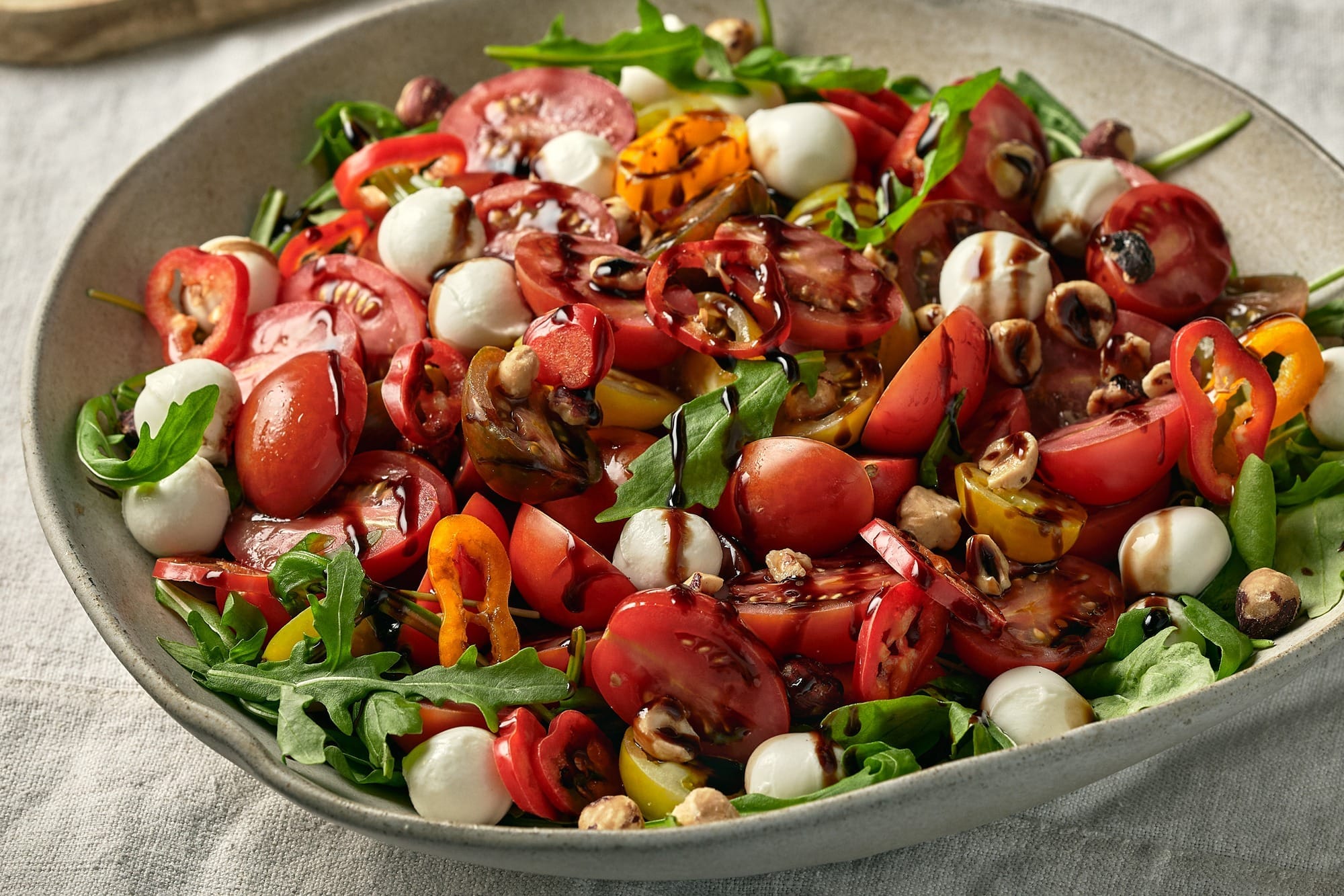 חגיגה צבעונית של עגבניות שרי עם בזיליקום וכדורי בייבי מוצרלה שמאירה כל שולחן וארוחה ומתאימה לאירועי חברה ומפגשים אינטימיים עם כל המשפחה.