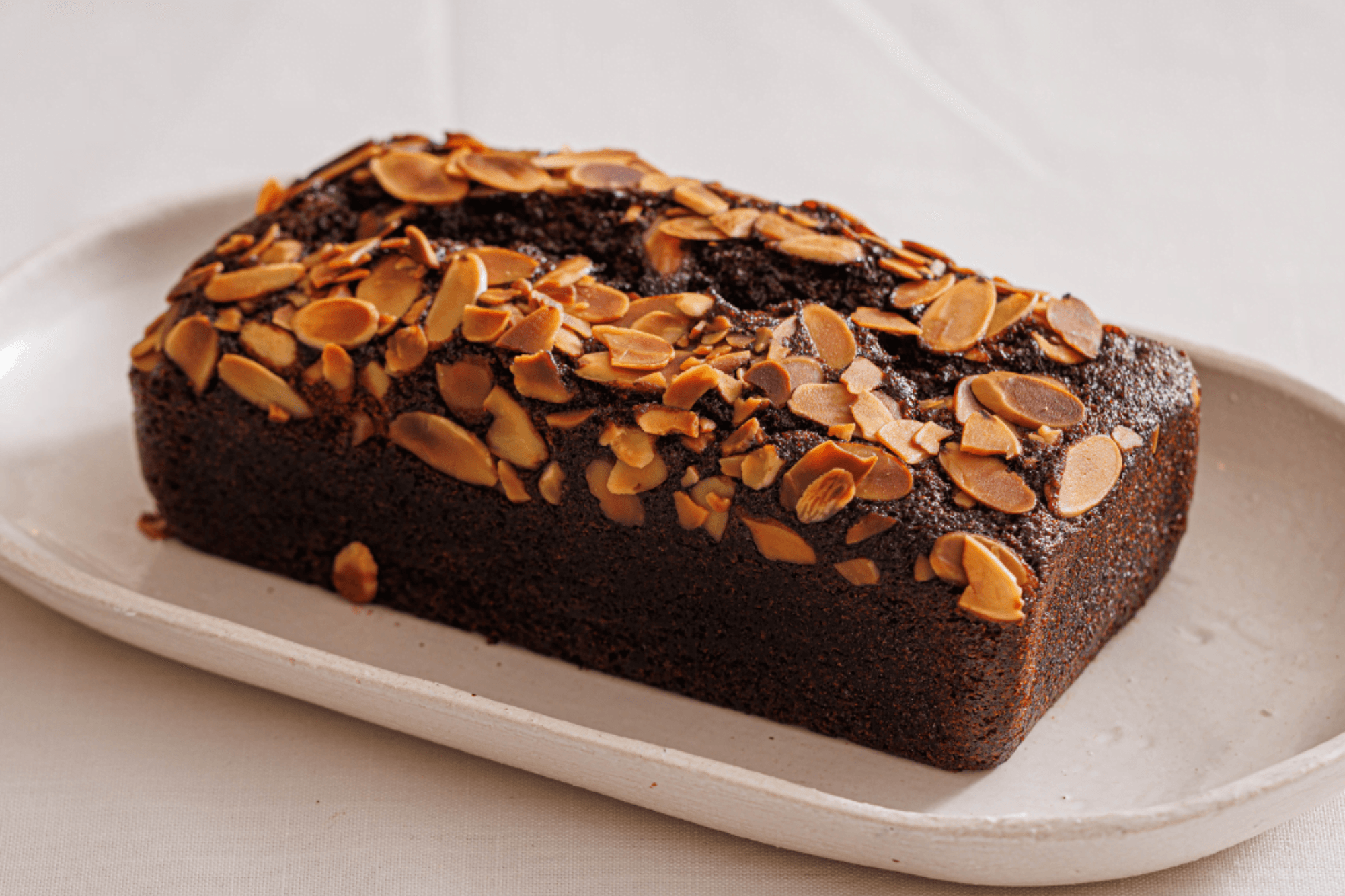 עוגה בחושה בטעמי קפה ודובדבני אמרנה איטלקיים, בעיטור שקדים קלויים מקונדיטוריית TENNE.