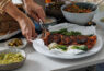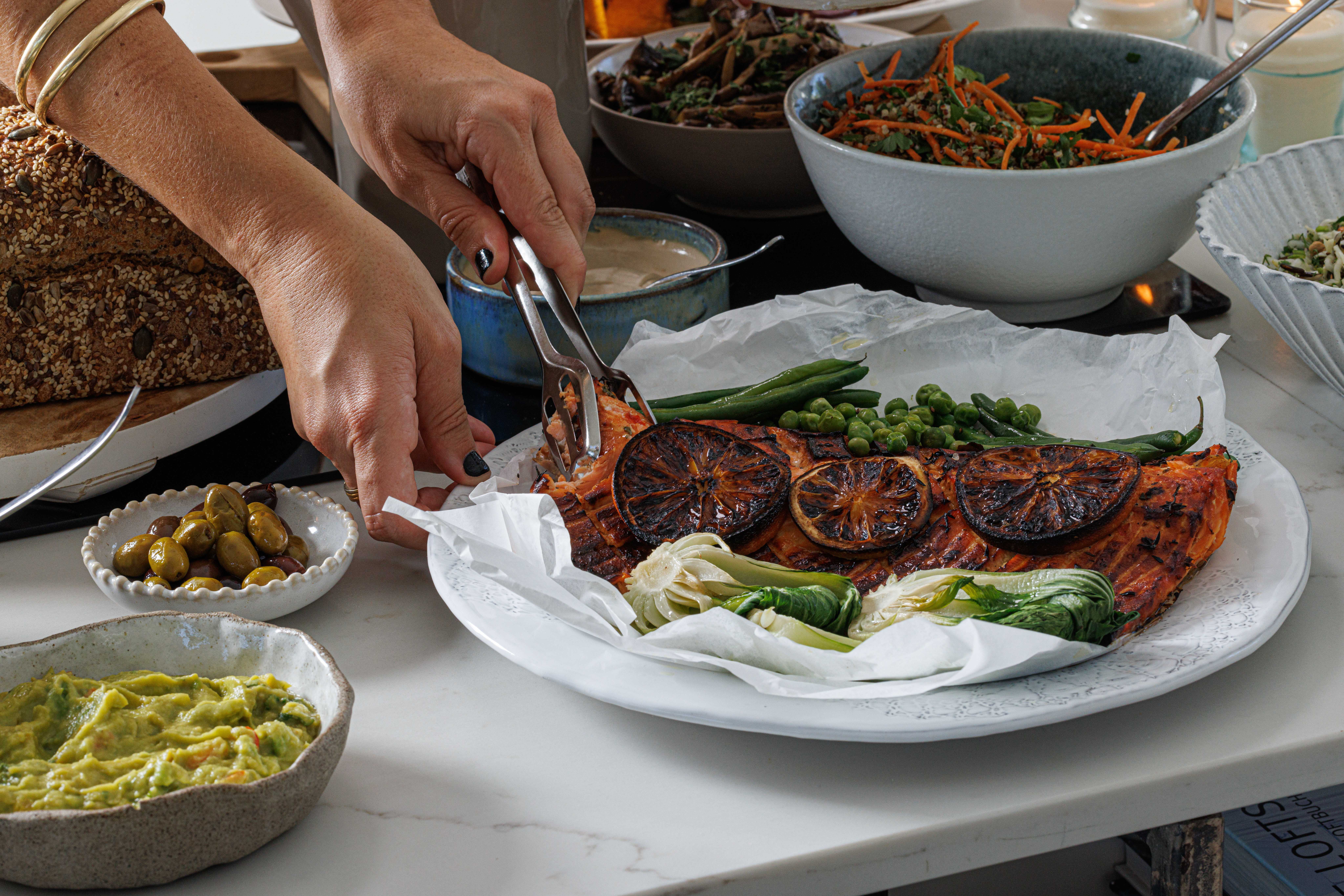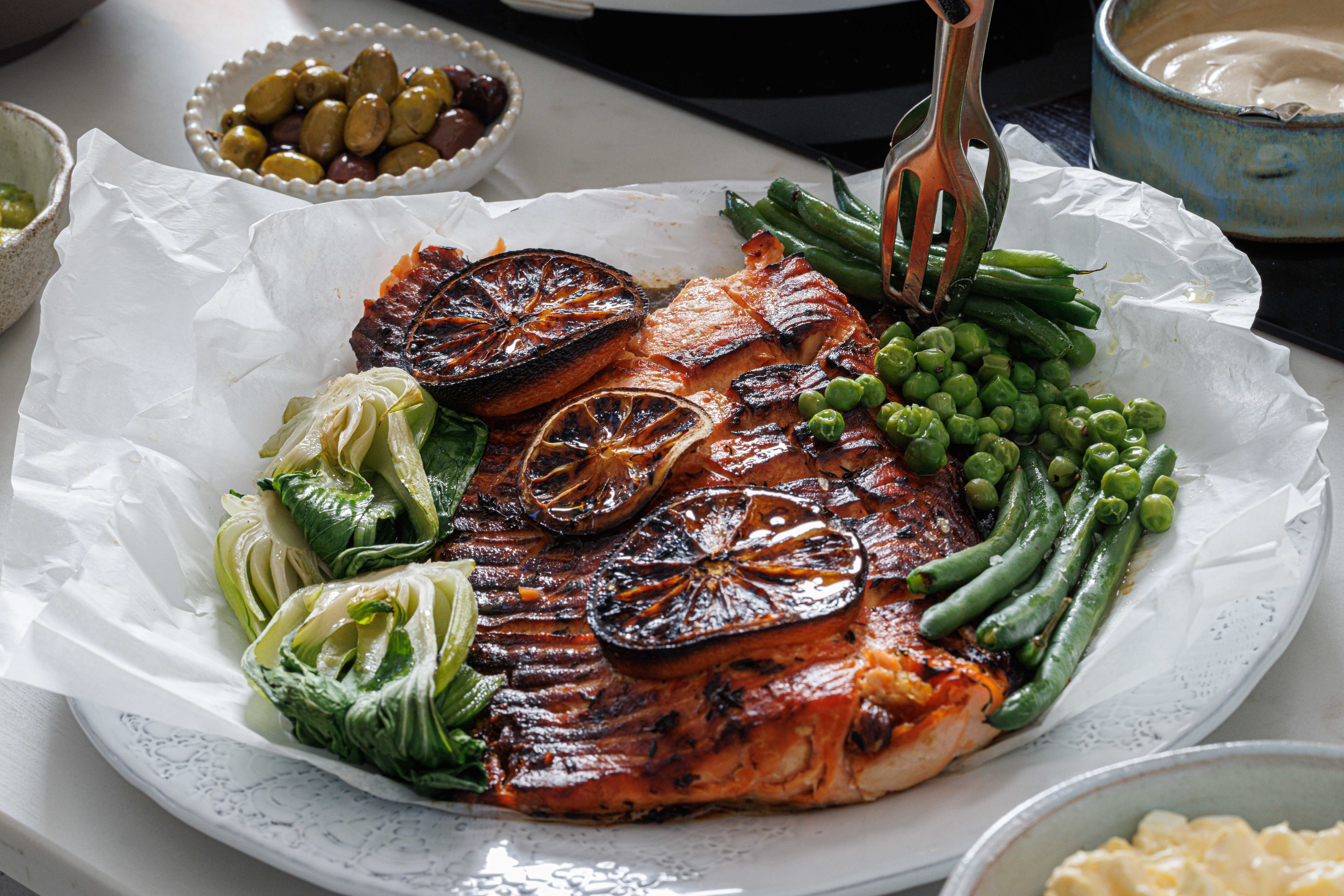 ירקות טריים, בוקצוי, שעועית ירוקה, רוטב הדרים. מוגש בתבנית אלומניום להגשה.