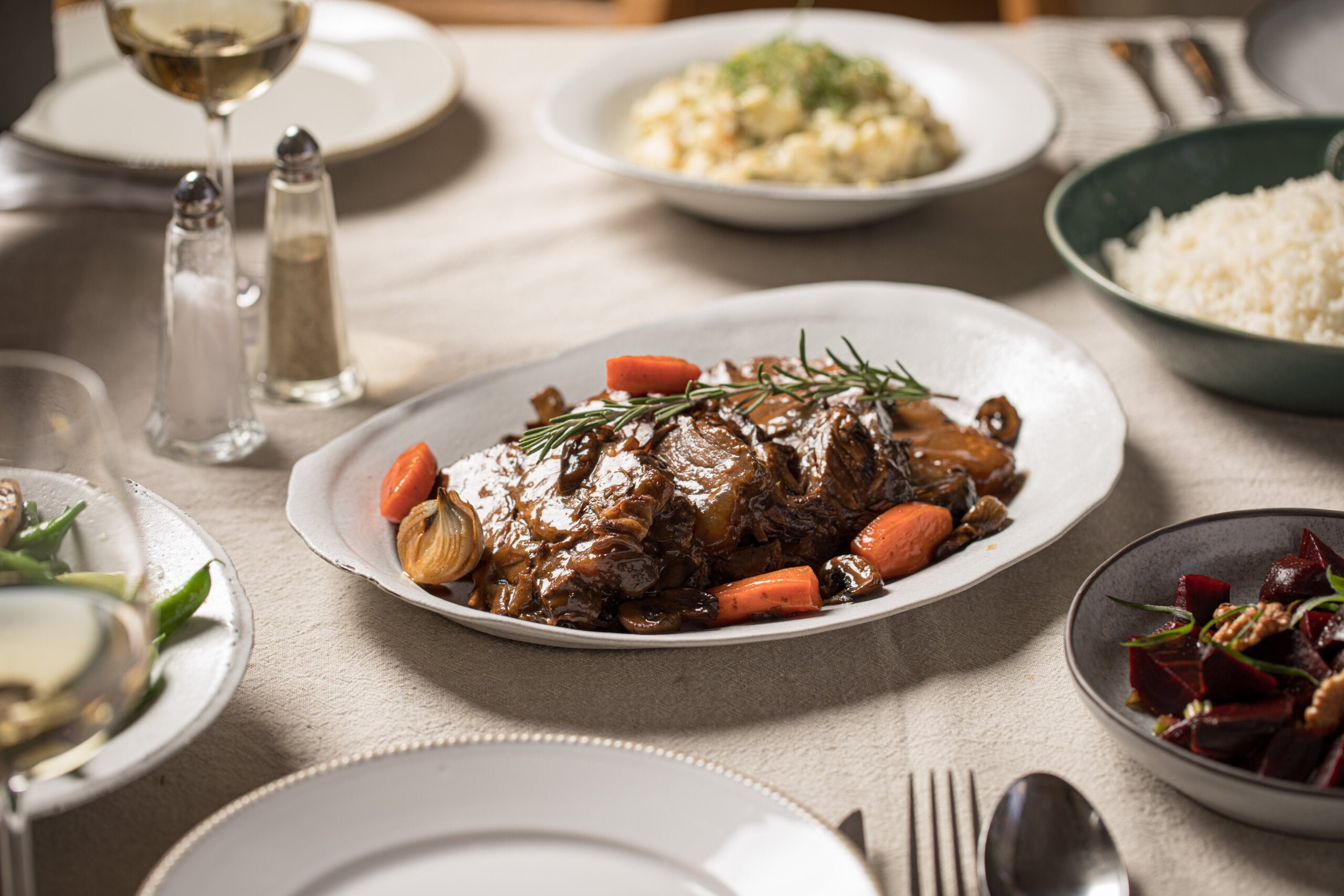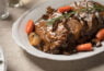 פרוסות של בשר בקר בבישול ארוך, בציר בקר, פטריות וירקות שורש.