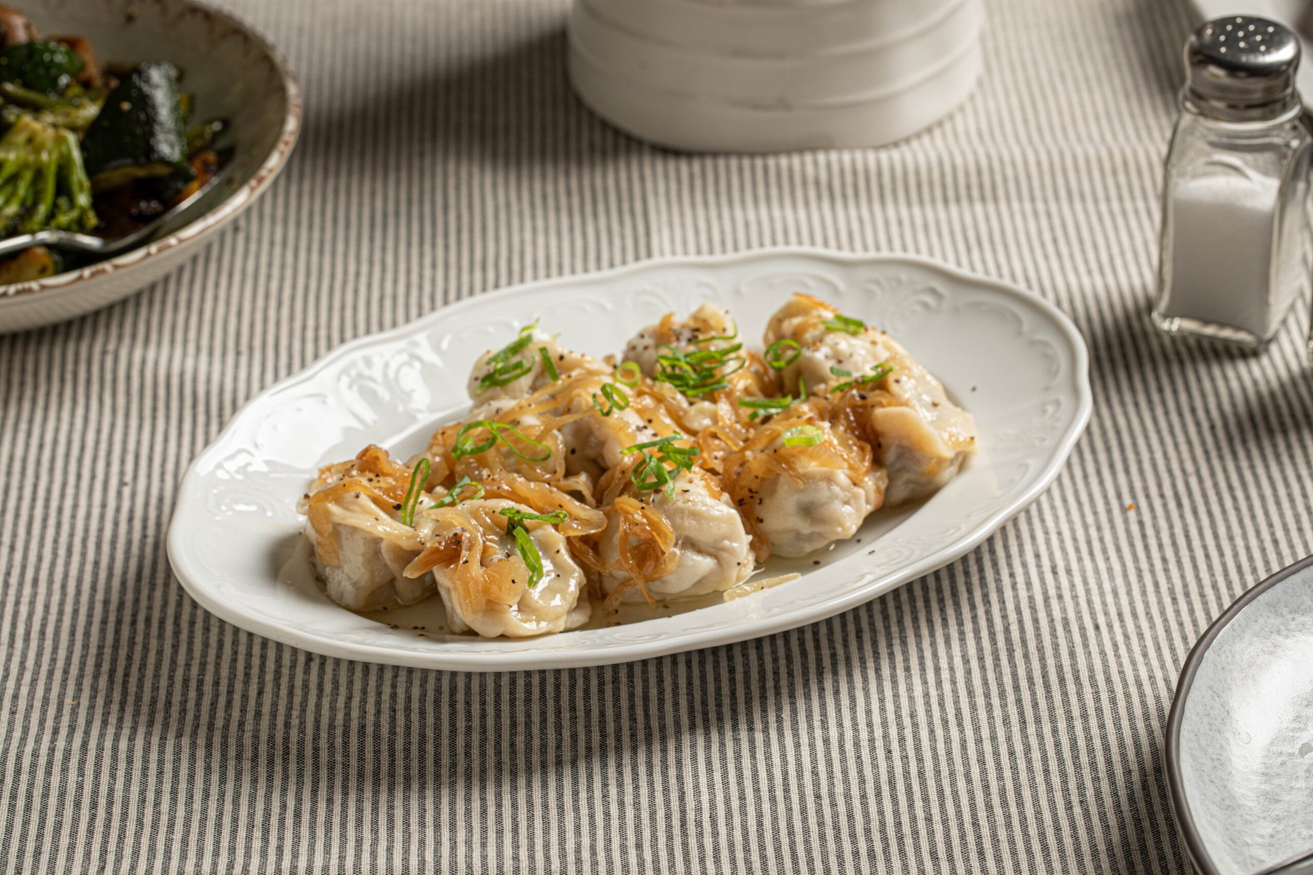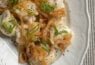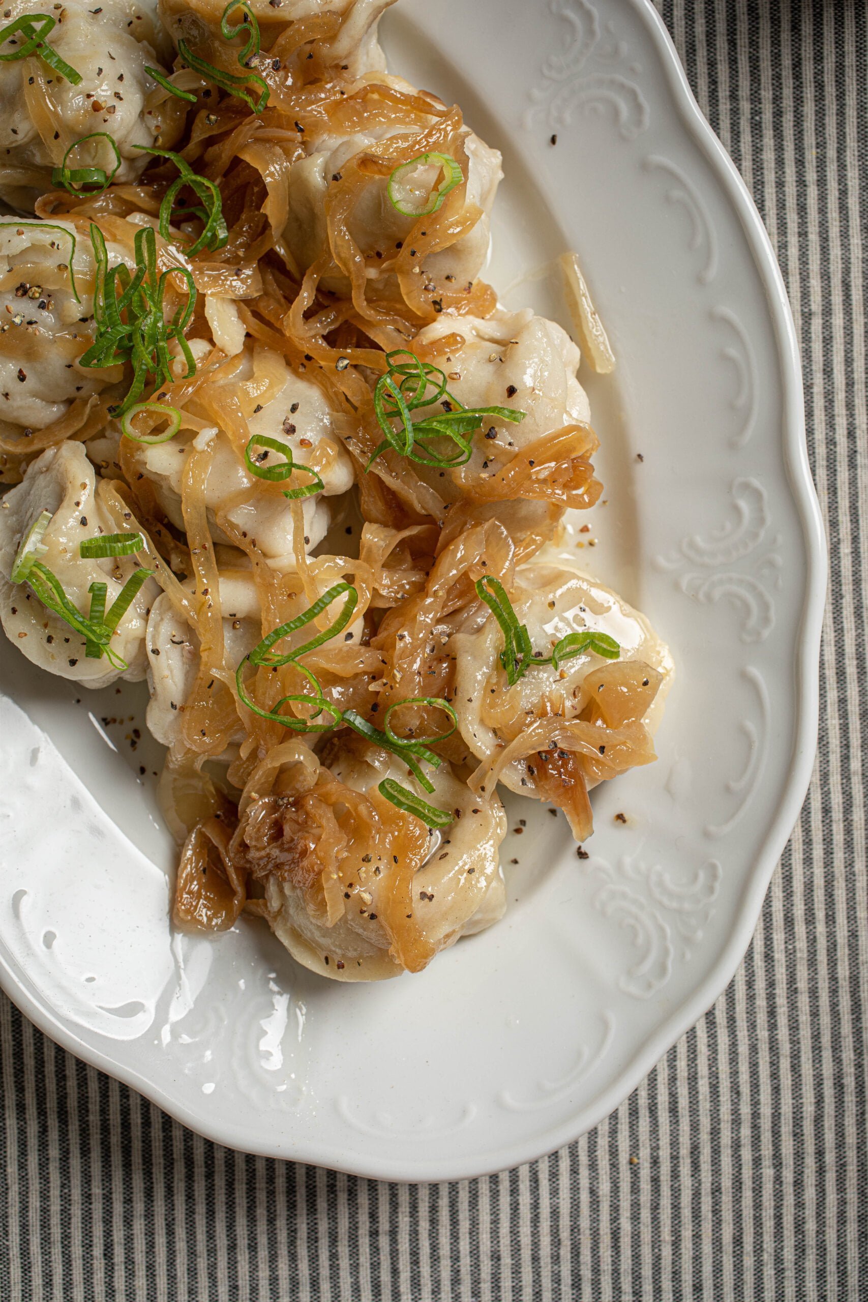 כיסוני בצק ממולאים בבשר, עם שפע של בצל מטוגן.