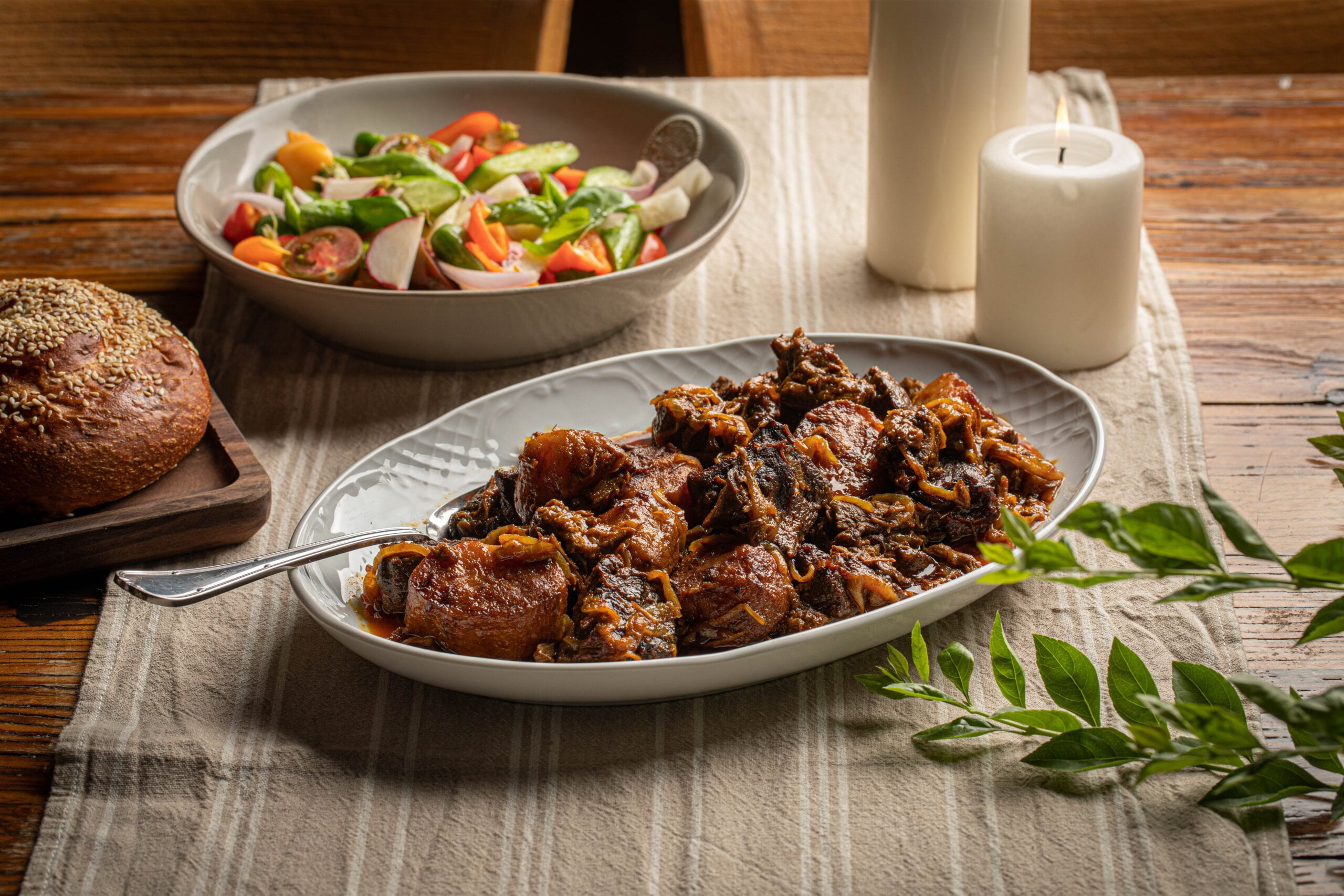 קוביות בשר בבישול ארוך, גרגרי חומוס, גזרים ורוטב עגבניות בתיבול מזרחי.